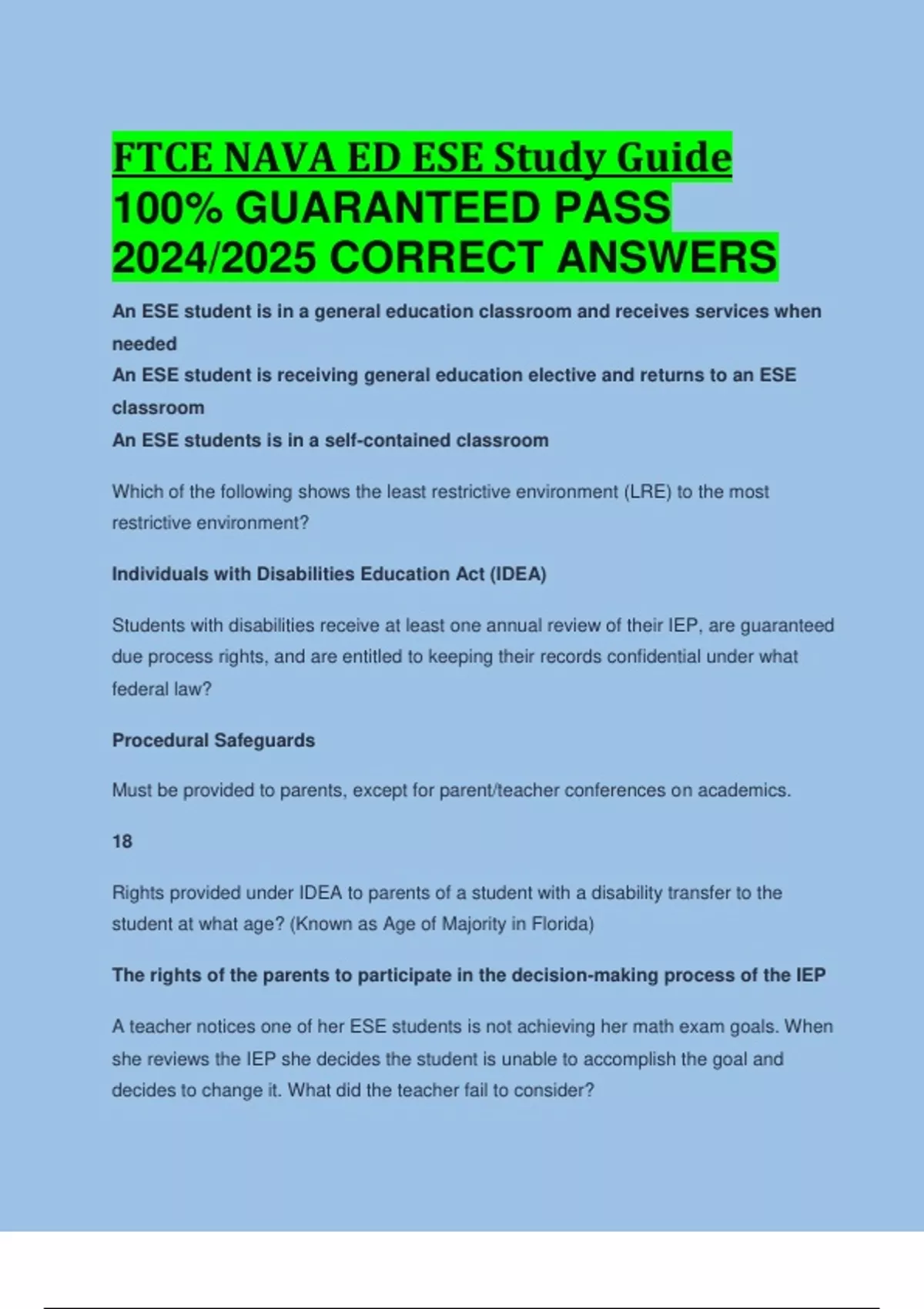 FTCE NAVA ED ESE Study Guide 100% GUARANTEED PASS 2024/2025 CORRECT ANSWERS