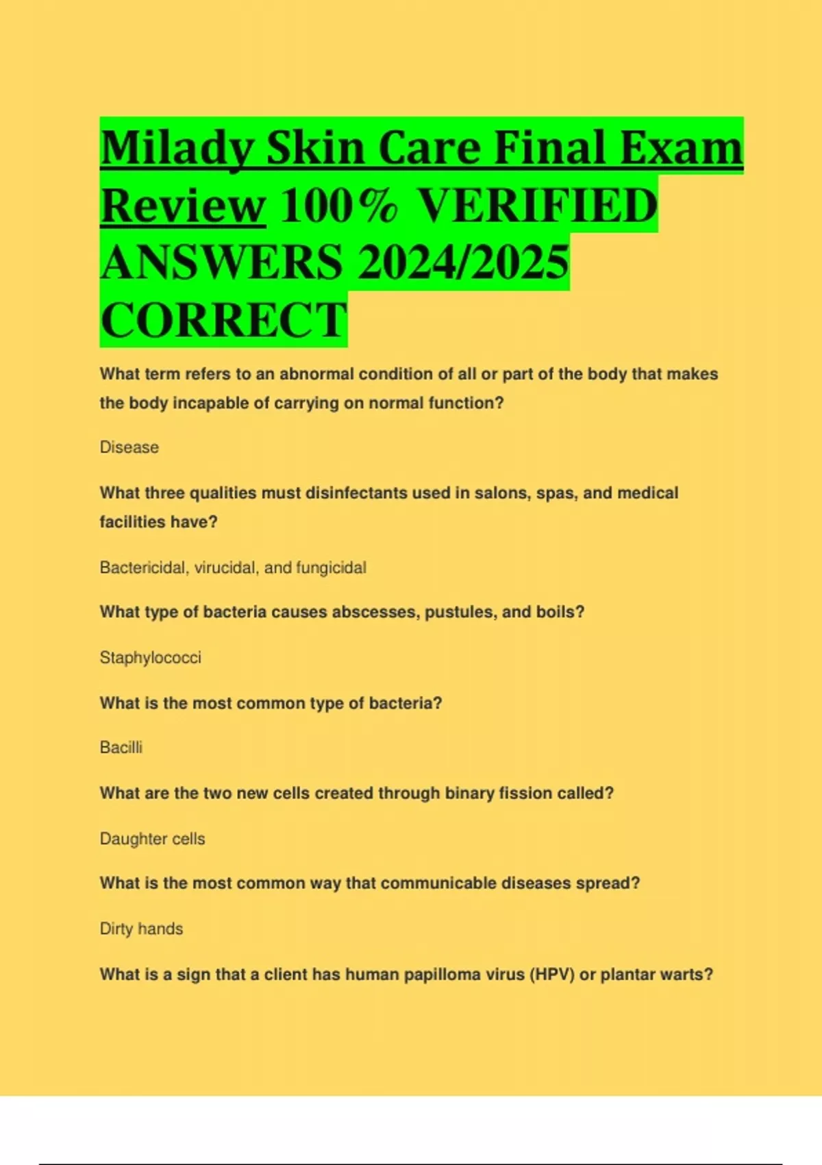 Milady Skin Care Final Exam Review 100% VERIFIED ANSWERS 2024/2025 CORRECT