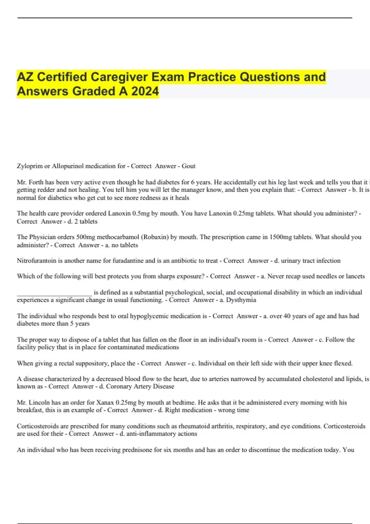 AZ Certified Caregiver Exam Practice Questions and Answers Graded A 2024