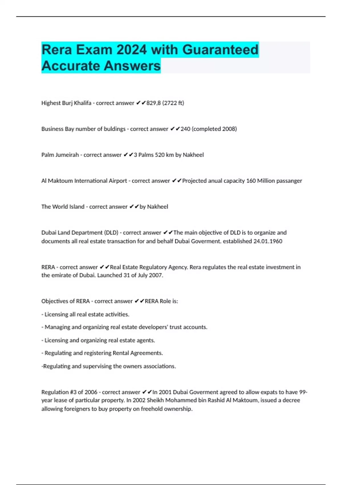 Highest Burj Khalifa - correct answer 829,8 (2722 ft) Business Bay number of buldings - correct answer 240 (completed 2008) Palm Jumeirah - correct answer 3 Palms 520 km by Nakheel Al Maktoum International Airport - correct answer Projected anual capacity 160 Million passanger The World Island - correct answer by Nakheel Dubai Land Department (DLD) - correct answer The main objective of DLD is to organize and documents all real estate transaction for and behalf Dubai Goverment. established 24.01.1960 RERA - correct answer Real Estate Regulatory Agency. Rera regulates the real estate investment in the emirate of Dubai. Launched 31 of July 2007. Objectives of RERA - correct answer RERA Role is: - Licensing all real estate activities. - Managing and organizing real estate developers' trust accounts. - Licensing and organizing real estate agents. - Regulating and registering Rental Agreements. -Regulating and supervising the owners associations.