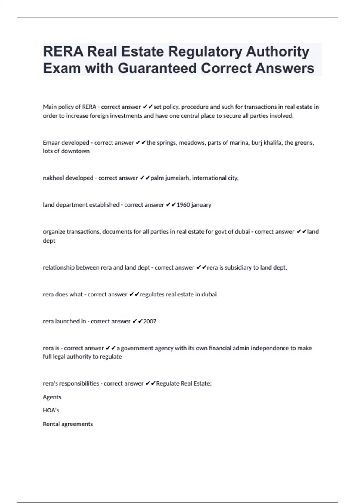 Main policy of RERA - correct answer set policy, procedure and such for transactions in real estate in order to increase foreign investments and have one central place to secure all parties involved. Emaar developed - correct answer the springs, meadows, parts of marina, burj khalifa, the greens, lots of downtown nakheel developed - correct answer palm jumeiarh, international city, land department established - correct answer 1960 january organize transactions, documents for all parties in real estate for govt of dubai - correct answer land dept relationship between rera and land dept - correct answer rera is subsidiary to land dept. rera does what - correct answer regulates real estate in dubai rera launched in - correct answer 2007 rera is - correct answer a government agency with its own financial admin independence to make full legal authority to regulate rera's responsibilities - correct answer Regulate Real Estate: Agents HOA's Rental