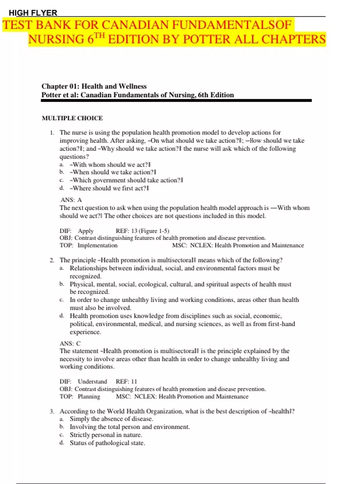 Test Bank for Canadian Fundamentals of Nursing, 6th Edition| Test Bank for Canadian Fundamentals of Nursing 6th Edition by Potter all chapters 1-48 (questions & answers) A+ guide. 1. The nurse is using the population health promotion model to develop actions for improving health. After asking, ―On what should we take action?‖; ―How should we take action?‖; and ―Why should we take action?‖ the nurse will ask which of the following questions? a. ―With whom should we act?‖ b. ―When should we take action?‖ c. ―Which government should take action?‖ d. ―Where should we first act?‖ ANS: A The next question to ask when using the population health model approach is ―With whom should we act?‖ The other choices are not questions included in this model. DIF: Apply REF: 13 (Figure 1-5) OBJ: Contrast distinguishing features of health promotion and disease prevention. TOP: Implementation MSC: NCLEX: Health Promotion and Maintenance 2. The principle ―Health promotion is multisectoral‖ means which of the following? a. Relationships between individual, social, and environmental factors must be recognized. b. Physical, mental, social, ecological, cultural, and spiritual aspects of health must be recognized. c. In order to change unhealthy living and working conditions, areas other than health must also be involved. d. Health promotion uses knowledge from disciplines such as social, economic, political, environmental, medical, and nursing sciences, as well as from first-hand experience. ANS: C The statement ―Health promotion is multisectoral‖ is the principle explained by the necessity to involve areas other than health in order to change unhealthy living and working conditions. DIF: Understand REF: 11 OBJ: Contrast distinguishing features of health promotion and disease prevention. TOP: Planning MSC: NCLEX: Health Promotion and Maintenance 3. According to the World Health Organization, what is the best description of ―health‖? a. Simply the absence of disease. b. Involving the total person and environment. c. Strictly personal in nature. d. Status of pathological state. WHO defines health as ―. . .the extent to which an individual or group is able, on the one hand, to realize aspirations and satisfy needs; and, on the other hand, to change or cope with the environment. Health is, therefore, seen as a resource for everyday life, not the objective of living; it is a positive concept emphasizing social and personal resources, as well as physical capacities.‖ Nurses‘ attitudes toward health and illness should consider the total person, as well as the environment in which the person lives. People free of disease are not equally healthy. Views of health have broadened to include mental, social, and spiritual well-being, as well as a focus on health at family and community levels. Conditions of life, rather than pathological states, are what determine health. DIF: Knowledge REF: 2 OBJ: Discuss ways that definitions of health have been conceptualized. TOP: Evaluate MSC: NCLEX: Health Promotion and Maintenance 4. What priority strategy for health promotion in Canada is optional but seen as important to incorporate in nursing education curricula? a. Knowledge of disease prevention. b. Strategies for health promotion. c. Policy advocacy. d. Concepts of determinants of health. ANS: C Increasingly, policy advocacy is incorporated into nursing role statements and nursing education curricula. Nurses should think about policies that have contributed to health problems, policies that would help alleviate health problems, and how nurses champion public policies. Disease prevention, health promotion, and concepts of determinants of health are integral parts of nursing curricula. DIF: Understand REF: 11| 12 OBJ: Analyze how the nature and scope of nursing practice are influenced by different conceptualizations of health and health determinants. MSC: NCLEX: Health Promotion and Maintenance TOP: Planning 5. Which of the following is a prerequisite for health, as identified by the Ottawa Charter for Health Promotion? a. Education. b. Social support. c. Self-esteem. d. Physical environment. ANS: A Education is one of the nine prerequisites for health that were identified in the Ottawa Charter for Health Promotion. Lack of social support and low self-esteem were identified as psychosocial risk factors by Labonte (1993). Dangerous physical environments were identified as socioenvironmental risk factors by Labonte (1993). DIF: Understand REF: 4 OBJ: Discuss contributions of the following Canadian publications to conceptualizations of health and health determinants: Lalonde Report, Ottawa Charter, Epp Report, Strategies for Population Health, Jakarta Declaration, Bangkok Charter, Toronto Charter. MSC: NCLEX: Health Promotion and Maintenance TOP: Planning HIGH FLYER TEST BANK FOR CANADIAN FUNDAMENTALSOF NURSING 6 TH EDITION BY POTTER ALL CHAPTERS 6. The determinant of health with the greatest effect on the health of Canadians is which of the following? a. Education. b. Health services. c. Socialsupport networks. d. Income and socialstatus. ANS: D Income, income distribution, and social status constitute the greatest determinant of health because they influence most other determinants. Some investigators suggest that literacy and education are important influences on health status because they affect many other health determinants. Approximately 25% of a population‘s health status is attributed to the quality of its health care services. Social support affects health, health behaviours, and health care utilization but is not the greatest determinant of health. DIF: Understand REF: 6 OBJ: Discuss key health determinants and their interrelationships and how they influence health. TOP: Planning MSC: NCLEX: Health Promotion and Maintenance 7. A paraplegic patient in the hospital for an electrolyte imbalance is receiving care at which prevention level? a. Primary prevention level. b. Secon