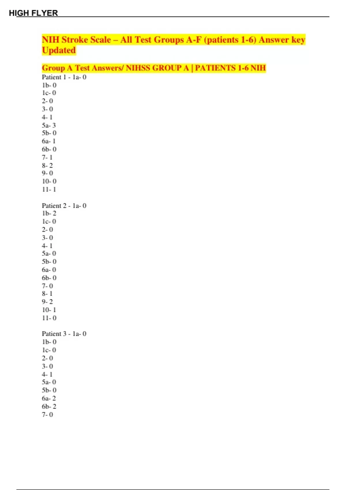 NIH Stroke Scale – All Test Groups A-F (patients 1-6) Answer key Updated Spring 2023. NIH Stroke Scale – All Test Groups A-F (patients 1-6) Answer key Updated Spring 2023. NIHSS - Group A Test Answers 2023/ NIHSS GROUP A | PATIENTS 1-6 NIH Stroke Scale Group B Patient 1-6 Answers (2023) NIHSS Group C - Patients 1-6 100% 2023 Passing answers. NIH Stroke Scale Group D Patient 1-6 Answers 2023. NIHSS-English Group E-V3 - 5th Certification (Answers 2023) NIH Stroke Scale Group F Patient 1-6 Answers 2023.