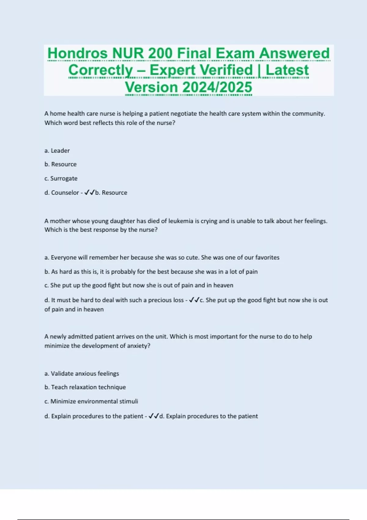 A home health care nurse is helping a patient negotiate the health care system within the community. Which word best reflects this role of the nurse? a. Leader b. Resource c. Surrogate d. Counselor - b. Resource A mother whose young daughter has died of leukemia is crying and is unable to talk about her feelings. Which is the best response by the nurse? a. Everyone will remember her because she was so cute. She was one of our favorites b. As hard as this is, it is probably for the best because she was in a lot of pain c. She put up the good fight but now she is out of pain and in heaven d. It must be hard to deal with such a precious loss - c. She put up the good fight but now she is out of pain and in heaven A newly admitted patient arrives on the unit. Which is most important for the nurse to do to help minimize the development of anxiety? a. Validate anxious feelings b. Teach relaxation technique c. Minimize environmental stimuli d. Explain procedures to the patient - d. Explain procedures to the patient