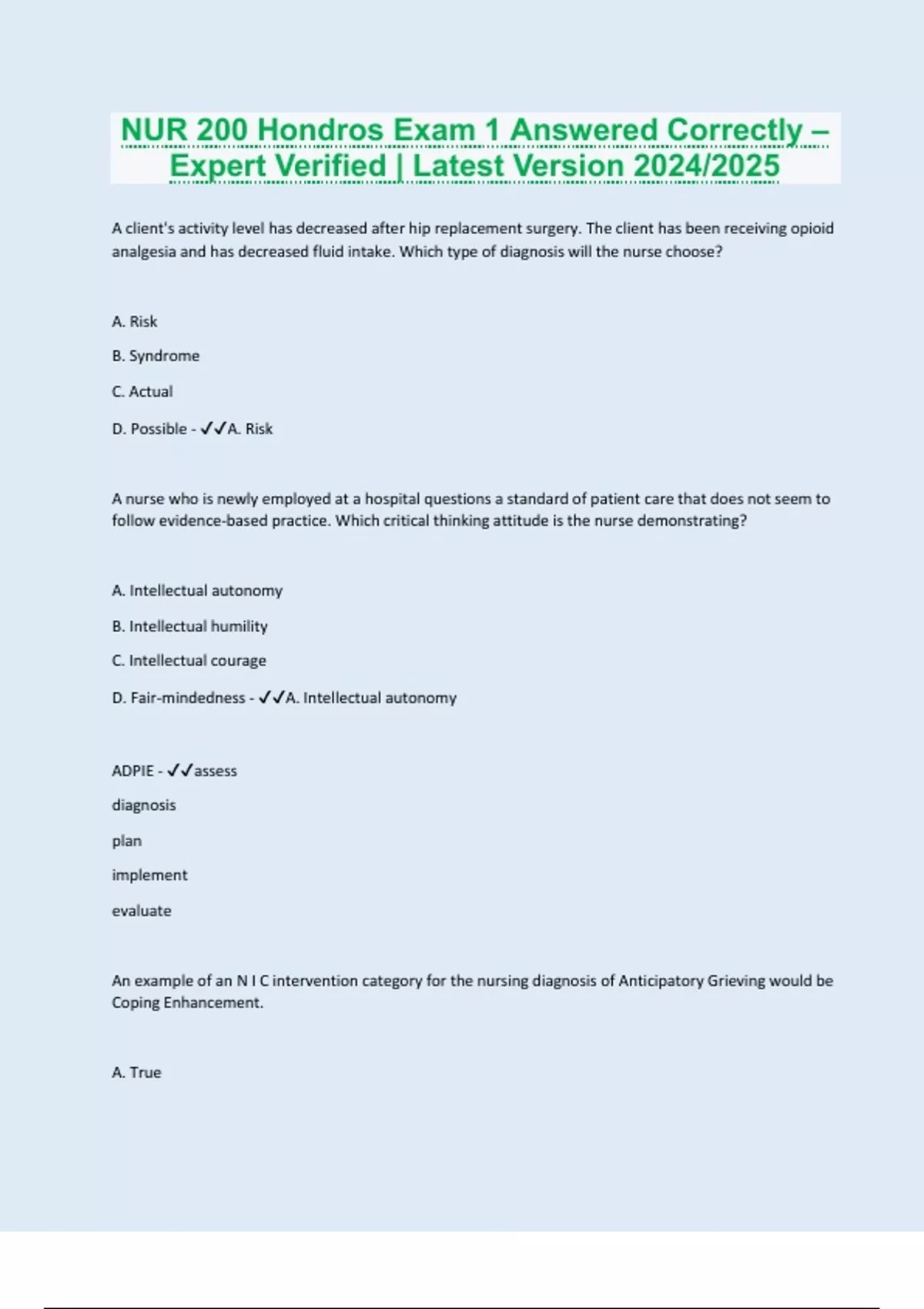 NUR 200 Hondros Exam 1 Answered Correctly – Expert Verified | Latest Version 2024/2025