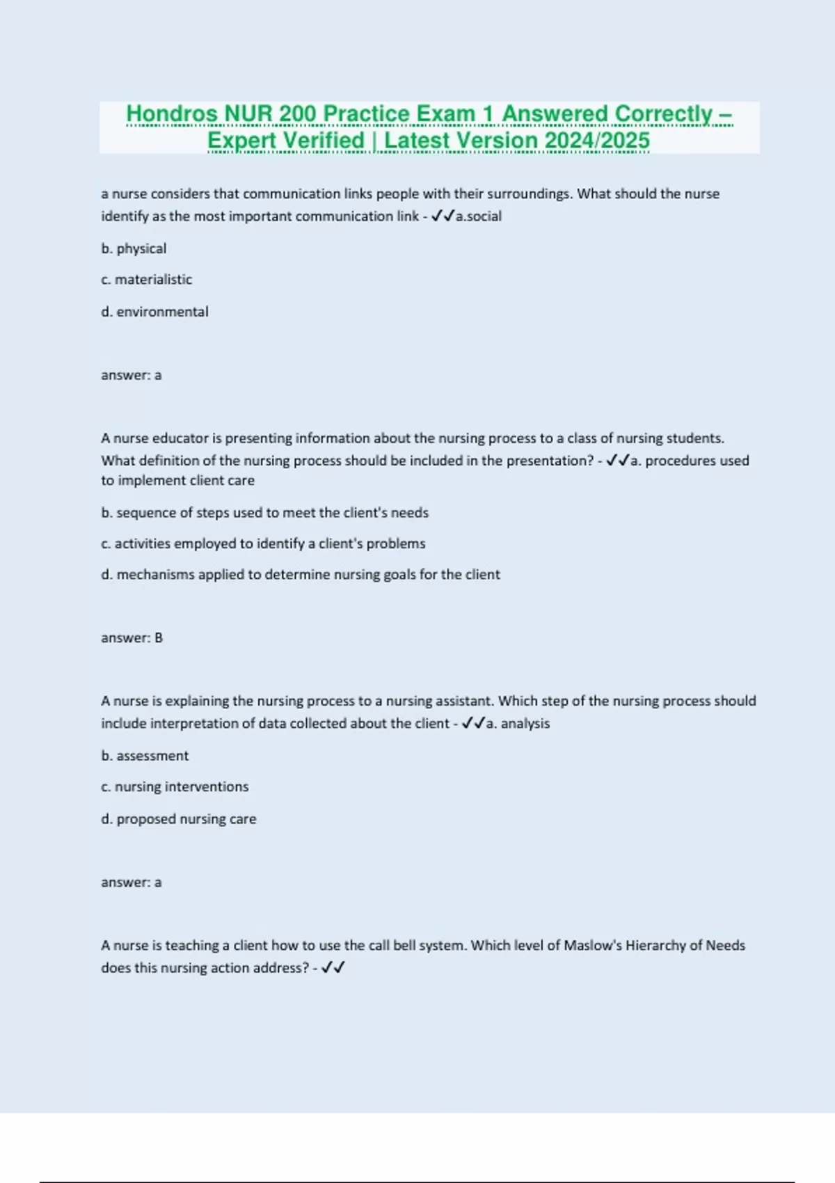 a nurse considers that communication links people with their surroundings. What should the nurse identify as the most important communication link - l b. physical c. materialistic d. environmental answer: a A nurse educator is presenting information about the nursing process to a class of nursing students. What definition of the nursing process should be included in the presentation? - a. procedures used to implement client care b. sequence of steps used to meet the client's needs c. activities employed to identify a client's problems d. mechanisms applied to determine nursing goals for the client answer: B A nurse is explaining the nursing process to a nursing assistant. Which step of the nursing process should include interpretation of data collected about the client - a. analysis b. assessment c. nursing interventions d. proposed nursing care answer: a A nurse is teaching a client how to use the call bell system. Which level of Maslow's Hierarchy of Needs does this nursing action address? -