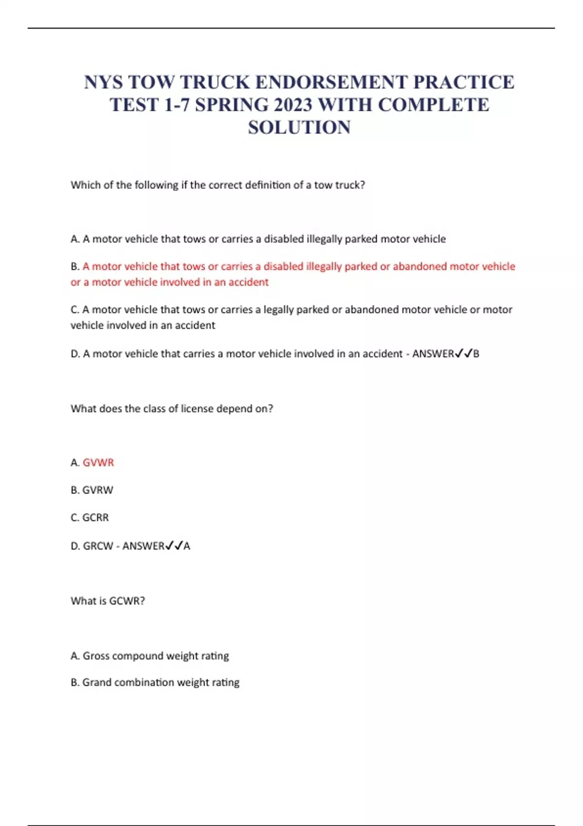 NYS TOW TRUCK ENDORSEMENT PRACTICE TEST 1-7 SPRING 2023 WITH COMPLETE SOLUTION