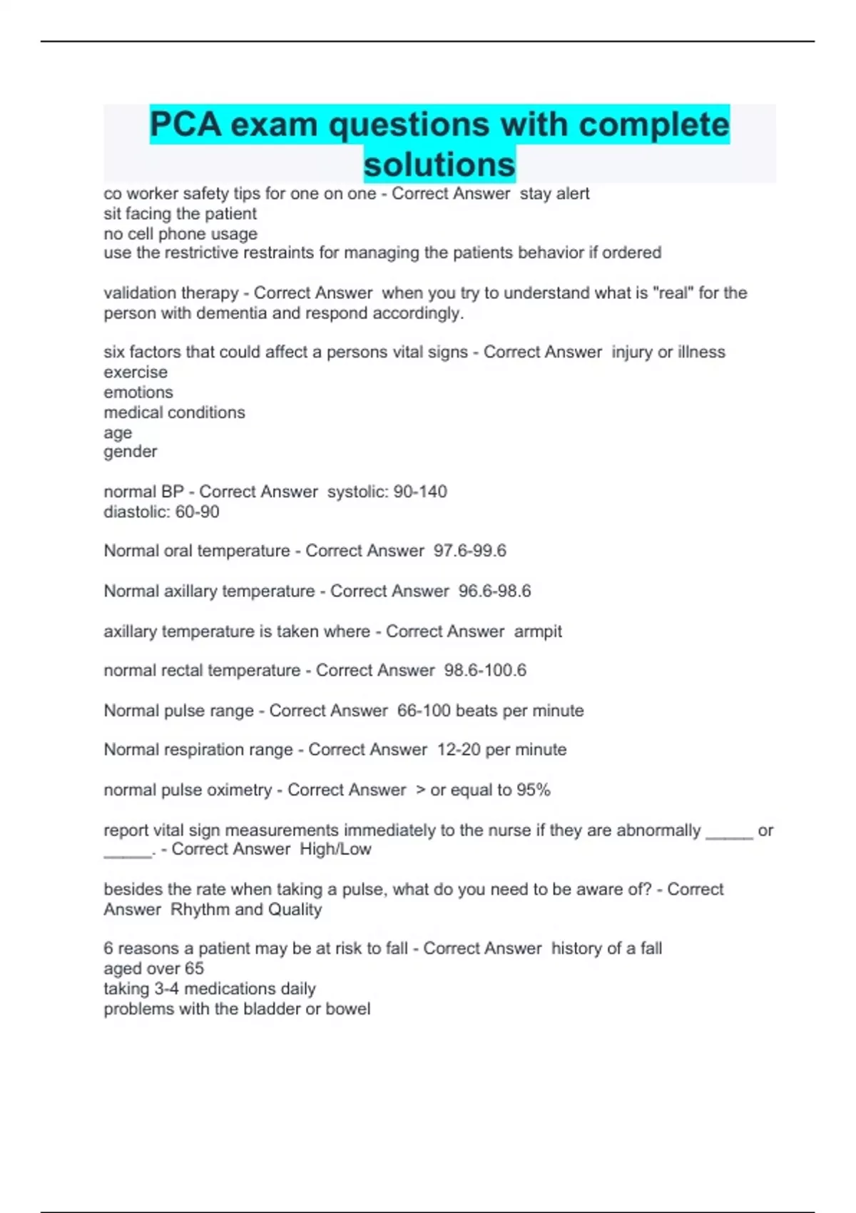 PCA exam questions with complete solutions co worker safety tips for one on one - Correct Answer stay alert sit facing the patient no cell phone usage use the restrictive restraints for managing the patients behavior if ordered validation therapy - Correct Answer when you try to understand what is "real" for the person with dementia and respond accordingly. six factors that could affect a persons vital signs - Correct Answer injury or illness exercise emotions medical conditions age gender normal BP - Correct Answer systolic: 90-140 diastolic: 60-90 Normal oral temperature - Correct Answer 97.6-99.6 Normal axillary temperature - Correct Answer 96.6-98.6 axillary temperature is taken where - Correct Answer armpit normal rectal temperature - Correct Answer 98.6-100.6