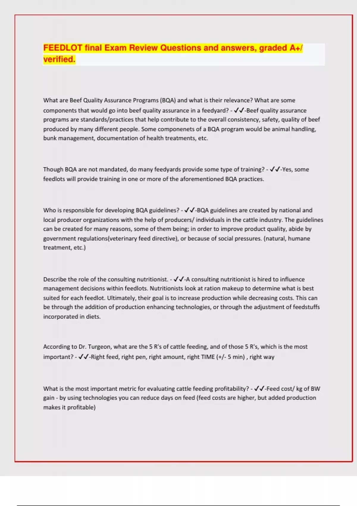 FEEDLOT final Exam Review Questions and answers, graded A+/ verified.[LATEST EXAM UPDATES]