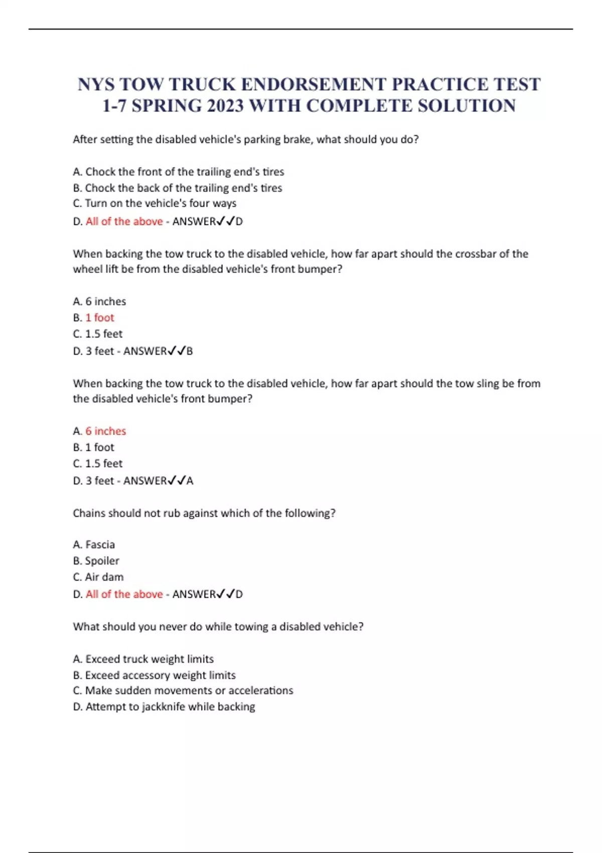 NYS Tow Truck Endorsement Practice Test 1-7 Spring 2023 with complete solution