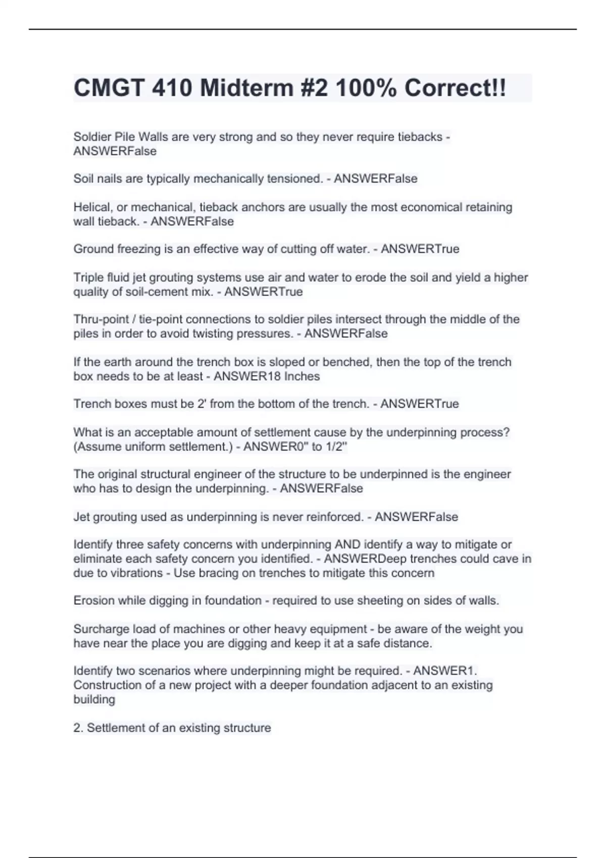 Soldier Pile Walls are very strong and so they never require tiebacks - ANSWERFalse Soil nails are typically mechanically tensioned. - ANSWERFalse Helical, or mechanical, tieback anchors are usually the most economical retaining wall tieback. - ANSWERFalse Ground freezing is an effective way of cutting off water. - ANSWERTrue Triple fluid jet grouting systems use air and water to erode the soil and yield a higher quality of soil-cement mix. - ANSWERTrue Thru-point / tie-point connections to soldier piles intersect through the middle of the piles in order to avoid twisting pressures. - ANSWERFalse If the earth around the trench box is sloped or benched, then the top of the trench box needs to be at least - ANSWER18 Inches Trench boxes must be 2' from the bottom of the trench. - ANSWERTrue What is an acceptable amount of settlement cause by the underpinning process? (Assume uniform settlement.) - ANSWER0'' to 1/2'' The original structural engineer of the structure to be underpinned is the engineer who has to design the underpinning. - ANSWERFalse Jet grouting used as underpinning is never reinforced. - ANSWERFalse Identify three safety concerns with underpinning AND identify a way to mitigate or eliminate each safety concern you identified. - ANSWERDeep trenches could cave in due to vibrations - Use bracing on trenches to mitigate this concern Erosion while digging in foundation - required to use sheeting on sides of walls. Su