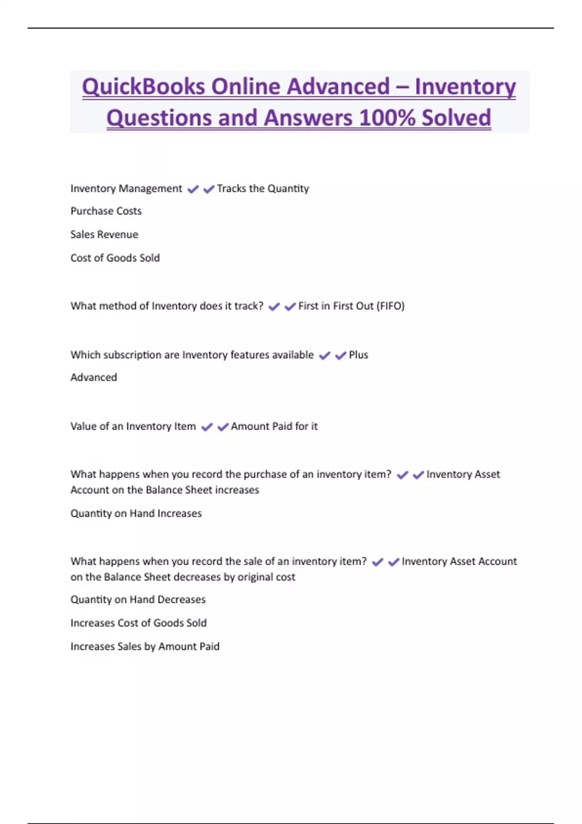 QuickBooks Online Advanced – Inventory Questions and Answers 100% Solved Inventory Management Tracks the Quantity Purchase Costs Sales Revenue Cost of Goods Sold What method of Inventory does it track? First in First Out (FIFO) Which subscription are Inventory features available Plus Advanced Value of an Inventory Item Amount Paid for it What happens when you record the purchase of an inventory item? Inventory Asset Account on the Balance Sheet increases Quantity on Hand Increase