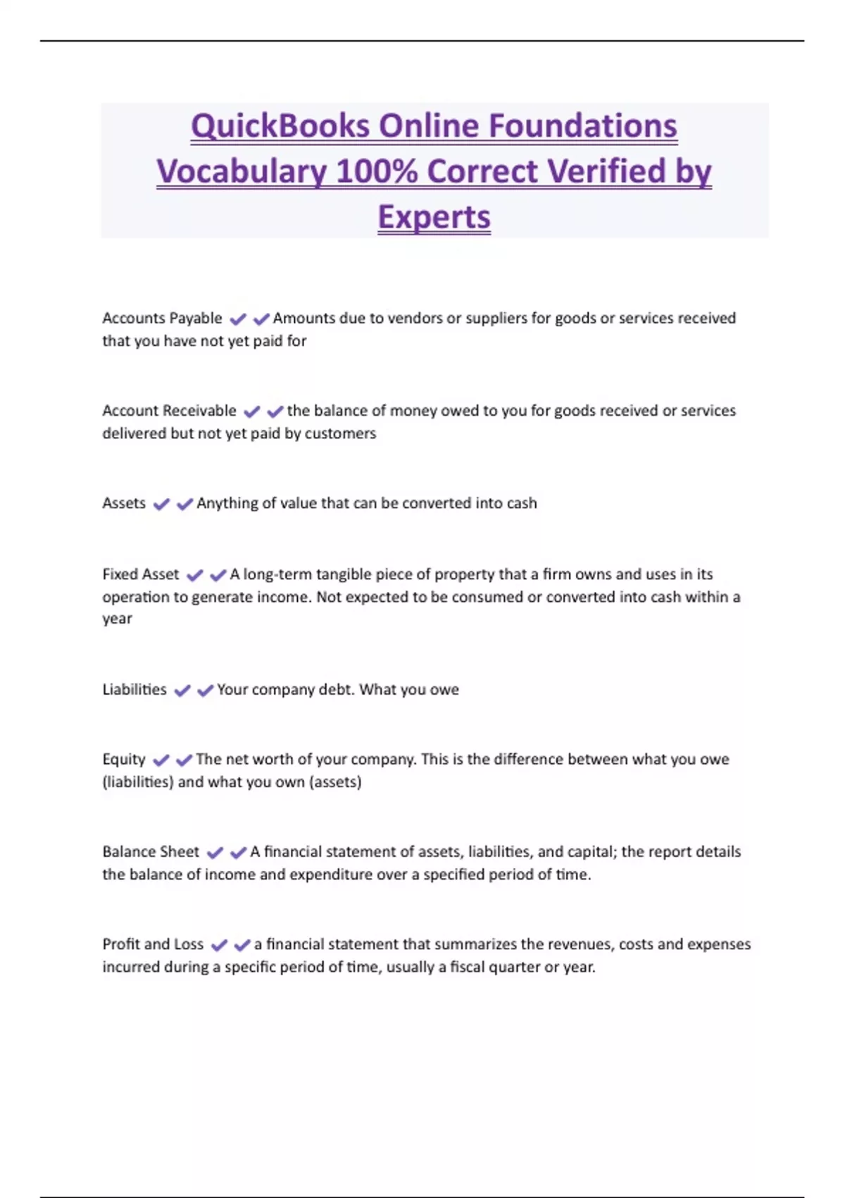 QuickBooks Online Foundations Vocabulary 100% Correct Verified by Experts Accounts Payable Amounts due to vendors or suppliers for goods or services received that you have not yet paid for Account Receivable the balance of money owed to you for goods received or services delivered but not yet paid by customers Assets Anything of value that can be converted into cash Fixed Asset A long-term tangible piece of property that a firm owns and uses in its operation to generate income. Not expected to be consumed or converted into cash within a year Liabilities Your company debt. What you owe