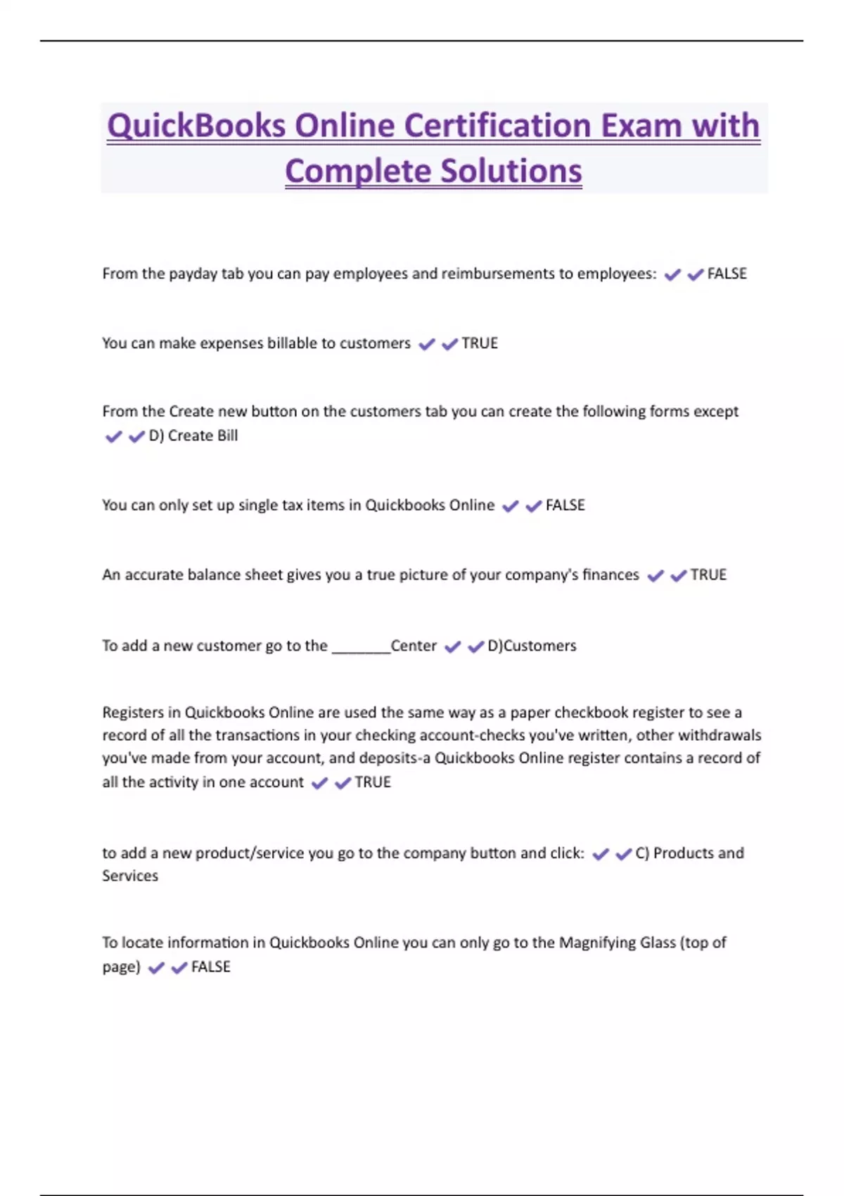 QuickBooks Online Certification Exam with Complete Solutions From the payday tab you can pay employees and reimbursements to employees: FALSE You can make expenses billable to customers TRUE From the Create new button on the customers tab you can create the following forms except D) Create Bill You can only set up single tax items in Quickbooks Online FALSE An accurate balance sheet gives you a true picture of your company's finances TRUE To add a new customer go to the _______Center D)Custome