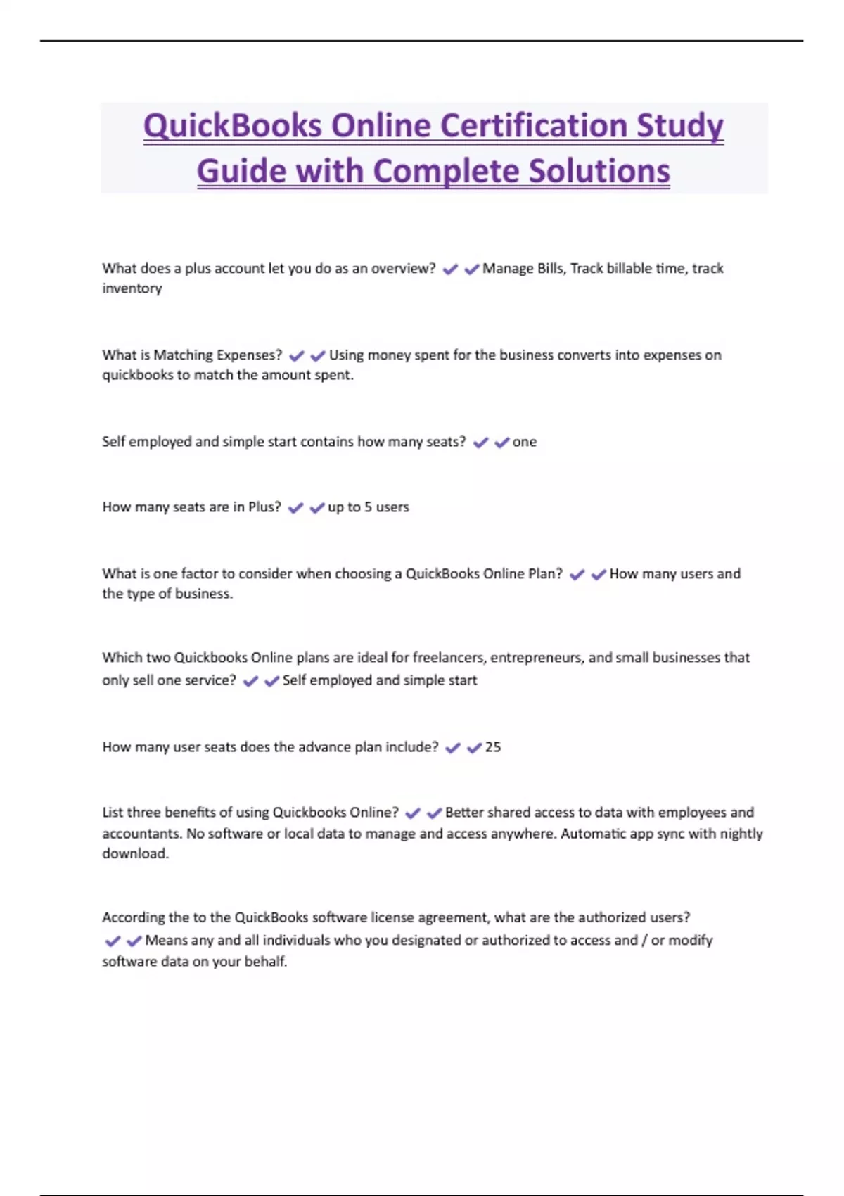 QuickBooks Online Certification Study Guide with Complete Solutions What does a plus account let you do as an overview? Manage Bills, Track billable time, track inventory What is Matching Expenses? Using money spent for the business converts into expenses on quickbooks to match the amount spent. Self employed and simple start contains how many seats? one How many seats are in Plus? up to 5 users What is one factor to consider when choosing a QuickBooks Online Plan? How many users and the type of business. Which two Quickbooks Online plans are ideal for freelancers, entrepreneurs, and small businesses that only sell one service? Self employed and simple start How many user seats does the advance plan include? 25
