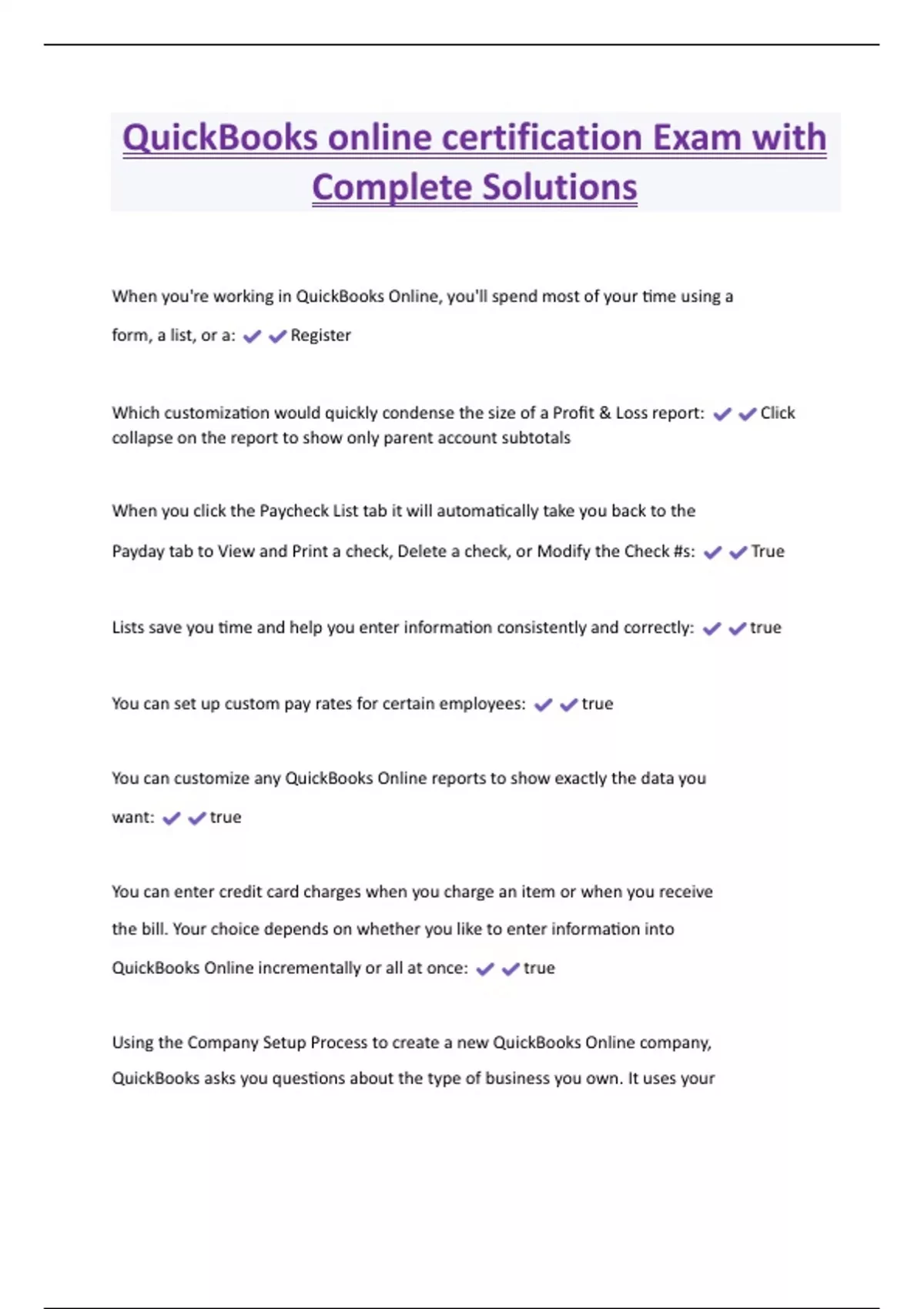 QuickBooks online certification Exam with Complete Solutions When you're working in QuickBooks Online, you'll spend most of your time using a form, a list, or a: Register Which customization would quickly condense the size of a Profit & Loss report: Click collapse on the report to show only parent account subtotals When you click the Paycheck List tab it will automatically take you back to the Payday tab to View and Print a check, Delete a check, or Modify the Check #s: True Lists save you time and help you enter information consistently and correctly: true You can set up custom pay rates for certain employees: true You can customize any QuickBooks Online reports to show exactly the data you want: true You can enter credit card charges when you charge an item or when you receive the bill. Your choice depends on whether you like to enter information into
