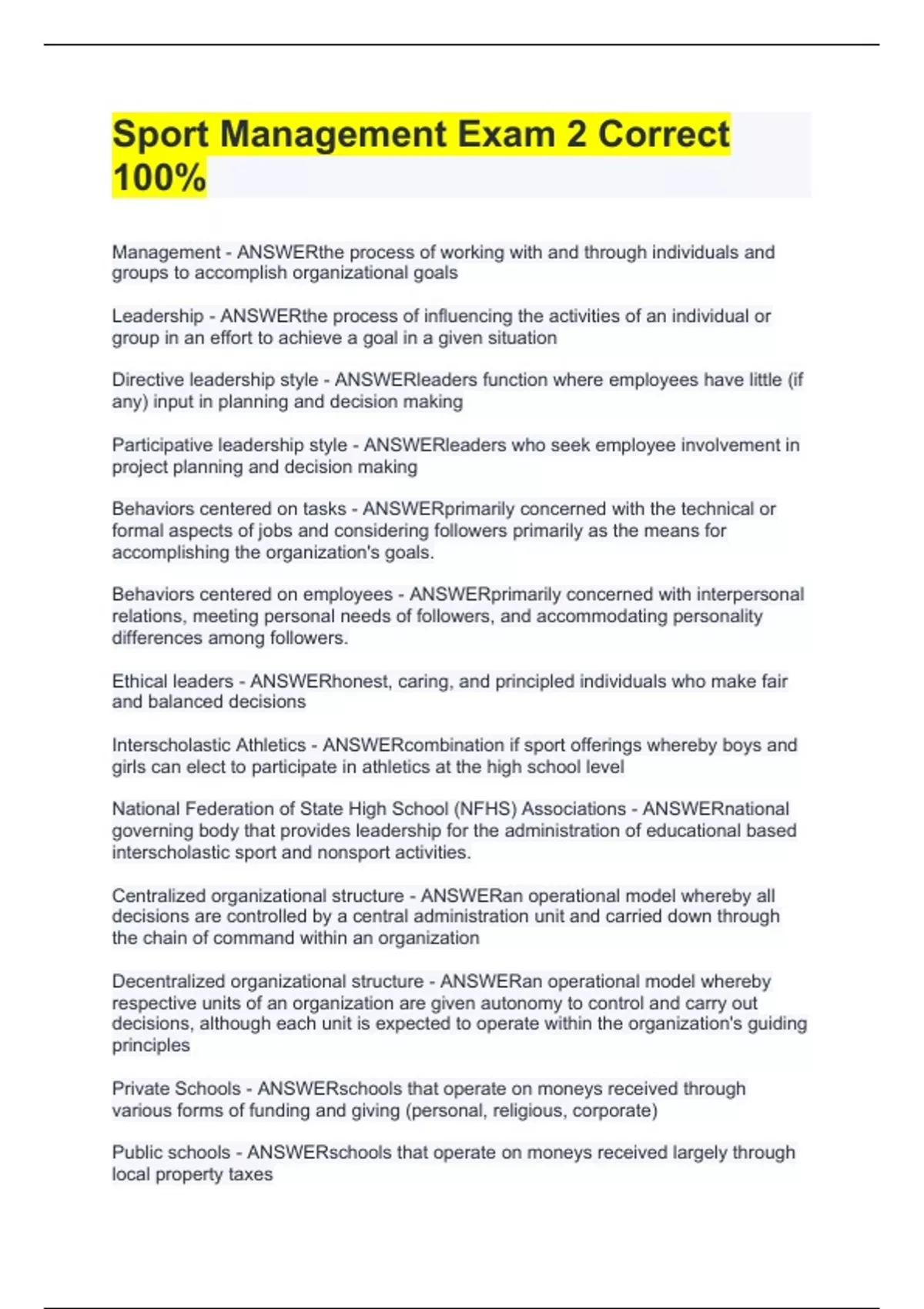 Management - ANSWERthe process of working with and through individuals and groups to accomplish organizational goals Leadership - ANSWERthe process of influencing the activities of an individual or group in an effort to achieve a goal in a given situation Directive leadership style - ANSWERleaders function where employees have little (if any) input in planning and decision making Participative leadership style - ANSWERleaders who seek employee involvement in project planning and decision making Behaviors centered on tasks - ANSWERprimarily concerned with the technical or formal aspects of jobs and considering followers primarily as the means for accomplishing the organization's goals. Behaviors centered on employees - ANSWERprimarily concerned with interpersonal relations, meeting personal needs of followers, and accommodating personality differences among followers. Ethical leaders - ANSWERhonest, caring, and principled individuals who make fair and balanced decisions Interscholastic Athletics - ANSWERcombination if sport offerings whereby boys and girls can elect to participate in athletics at the high school level National Federation of State High School (NFHS) Associations - ANSWERnational governing body that provides leadership for the administration of educational based interscholastic sport and nonsport activities. Centralized organizational structure - ANSWERan operational model whereby all decisions are controlled by a central administration unit and carried down through the chain of command within an organization