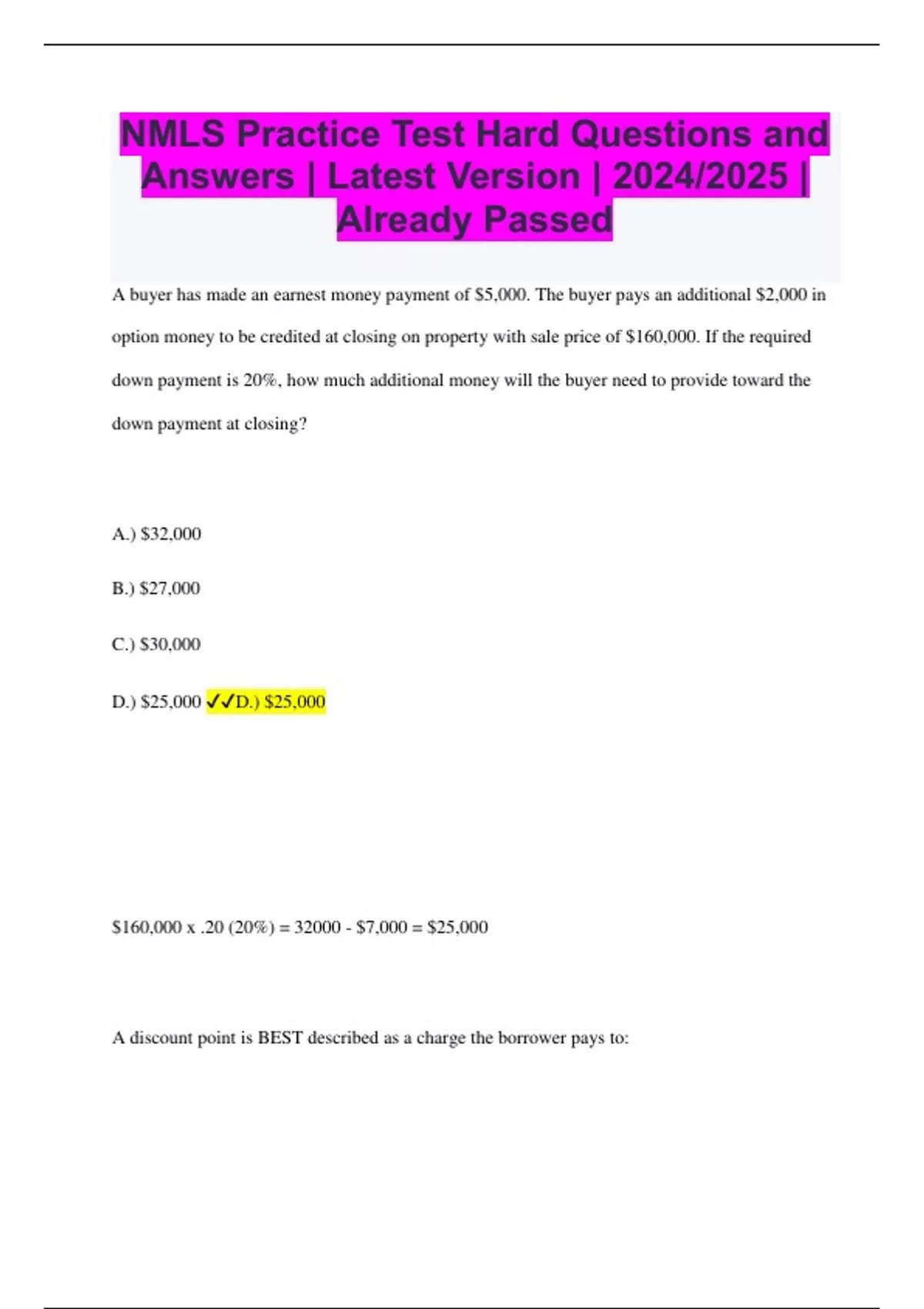 NMLS Practice Test Hard Questions and Answers | Latest Version | 2024/2025 | Already Passed A buyer has made an earnest money payment of $5,000. The buyer pays an additional $2,000 in option money to be credited at closing on property with sale price of $160,000. If the required down payment is 20%, how much additional money will the buyer need to provide toward the down payment at closing? A.) $32,000 B.) $27,000 C.) $30,000 D.) $25,000 D.) $25,000 $160,000 x .20 (20%) = 32000 - $7,000 = $25,000 A discount point is BEST described as a charge the borrower pays to: A.) A lender to decrease the interest rate on the mortgage loan B.) A mortgage broker at the time of application to obtain a favorable rate C.) The seller as part of the closing costs of a loan D.) A lender to ensure against foreclosure A.) A lender to decrease the interest rate on the mortgage loan A five bedroom, one bathroom house is an example of: A.) Appreciation B.) Functional Obsolescence C.) Economic Obsolescence D.) Residential Obsolescence B.) Functional Obsolescence A funding fee if required for a: A.) FHA loan B.) VA loan C.) Jumbo loan D.) Conventional loan B.) VA loan A loan closes on May 14. When is the first mortgage payment due? A.) May 15 B.) June 1