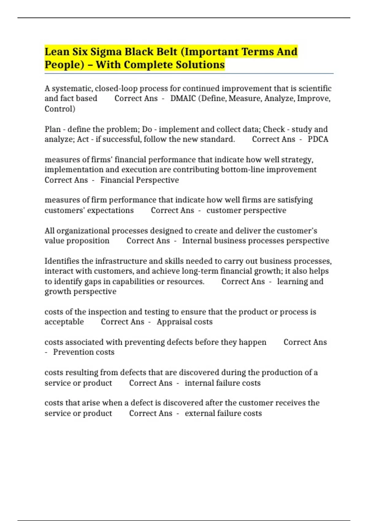Lean Six Sigma Black Belt (Important Terms And People) – With Complete Solutions