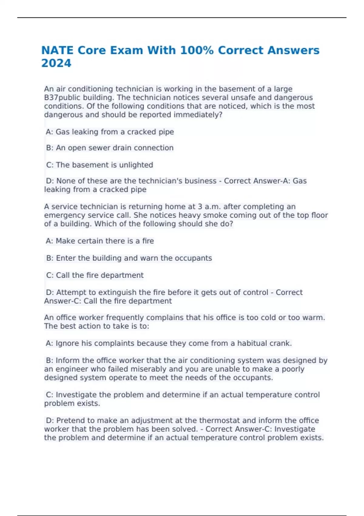 NATE Core Exam With 100% Correct Answers 2024 An air conditioning technician is working in the basement of a large B37public building. The technician notices several unsafe and dangerous conditions. Of the following conditions that are noticed, which is the most dangerous and should be reported immediately?