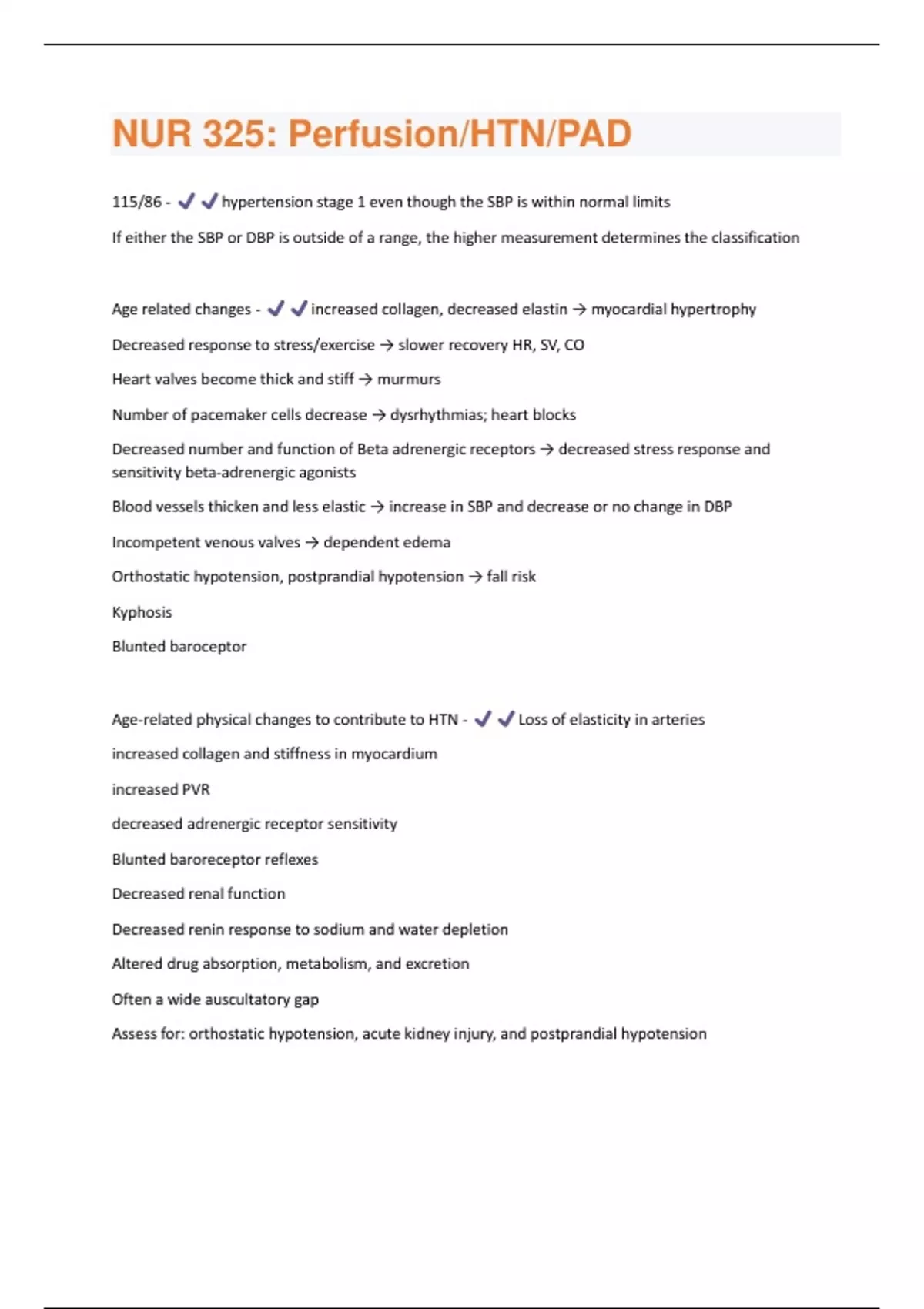 115/86 - hypertension stage 1 even though the SBP is within normal limits If either the SBP or DBP is outside of a range, the higher measurement determines the classification Age related changes - increased collagen, decreased elastin → myocardial hypertrophy Decreased response to stress/exercise → slower recovery HR, SV, CO Heart valves become thick and stiff → murmurs Number of pacemaker cells decrease → dysrhythmias; heart blocks Decreased number and function of Beta adrenergic receptors → decreased stress response and sensitivity beta-adrenergic agonists Blood vessels thicken and less elastic → increase in SBP and decrease or no change in DBP Incompetent venous valves → dependent edema Orthostatic hypotension, postprandial hypotension → fall risk Kyphosis Blunted baroceptor Age-related physical changes to contribute to HTN - Loss of elasticity in arteries increased collagen and stiffness in myocardium increased PVR decreased adrenergic receptor sensitivity Blunted baroreceptor reflexes Decreased renal function Decreased renin response to sodium and water depletion Altered drug absorption, metabolism, and excretion Often a wide auscultatory gap Assess for: orthostatic hypotension, acute kidney injury, and postprandial hypotensionAHA's Eat better - DASH eating plan (Fruits, vegetables, fat-free or low-fat milk/milk products, whole grains, fish, poultry, beans, seeds, and nuts, K, Mg, Ca) Reduce sodium intake!! Avoid AHA's salty 6: bread/rolls, lunch and cured meats, sandwiches, pizza, soup, poultry Moderate alcohol intake AHA's Get Active - Moderate intensity aerobic activity at least 30 mins at least 5 days a week for the goal of 150 mins/week Muscle strength 2x/week Flexibility and balance 2x/week especially for older adults to decrease falls AHA's lose weight - 1 kg lost = 1 mmHg decrease in SBP AHA's simple 7 - (1) Manage BP, (2) Control cholesterol, (3) Reduce blood sugar (4) Get active (5) Eat better (6) Lose weight (7) Stop smoking AHA's stop smoking - Nicotine causes vasoconstriction and elevated BP Smoking cessation reduces risk factors within 1 year Ambulatory care for PAD - Daily inspection of the feet (checking for bruising, pulses, temperature, color, bleeding) Comfortable shoes with rounded toes and soft insoles; shoes lightly laced Show how to check skin temperature, capillary refill, and palpate pulses Anoxia - lack of oxygenBest treatment (exercise) for claudication - *Walking is the most effective exercise for claudication!!* 30-45 mins daily 3x/week Blood pressure - force exerted by blood against walls of blood vessels CO = SV x HR Cardiac Output - the amount of blood the heart pumps through the circulatory system in a minute (CO)= Stroke volume (amount ejected with each heartbeat) x heart rate Central Perfusion - Force of blood movement by cardiac output Requires adequate cardiac function, blood pressure, and blood volume