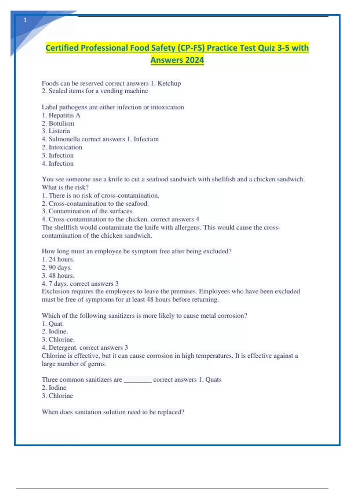 Certified Professional Food Safety (CP-FS) Practice Test Quiz 3-5 with Answers 2024