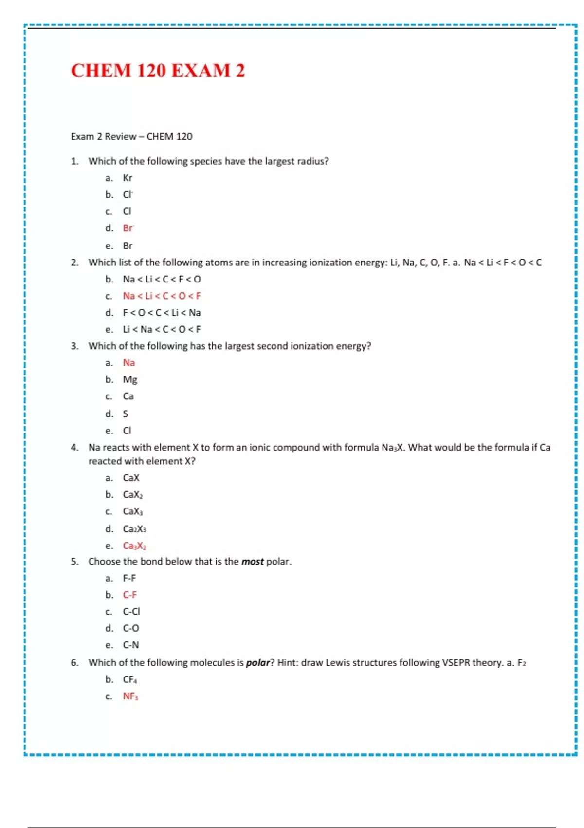 Exam 2 Review – CHEM 120 1. Which of the following species have the largest radius? a. Kr b. Cl- c. Cl d. Br- e. Br 2. Which list of the following atoms are in increasing ionization energy: Li, Na, C, O, F. a. Na Li F O C b. Na Li C F O c. Na Li C O F d. F O C Li Na e. Li Na C O F 3. Which of the following has the largest second ionization energy? a. Na b. Mg c. Ca d. S e. Cl 4. Na reacts with element X to form an ionic compound with formula Na3X. What would be the formula if Ca reacted with element X? a. CaX b. CaX2 c. CaX3 d. Ca2X3 e. Ca3X2