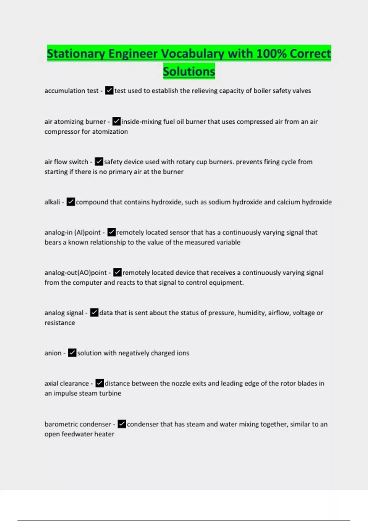Stationary Engineer Vocabulary with 100% Correct Solutions