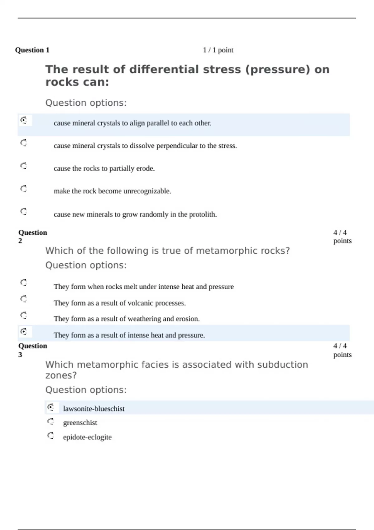 uestion 11 / 1 point The result of differential stress (pressure) onrocks can:Question options:cause mineral crystals to align parallel to each mineral crystals to dissolve perpendicular to the the rocks to partially the rock become new minerals to grow randomly in the protolith. Question4 / 42points Which of the following is true of metamorphic rocks?Question options:They form when rocks melt under intense heat and pressureThey form as a result of volcanic processes.They form as a result of weathering and erosion.They form as a result of intense heat and pressure.
