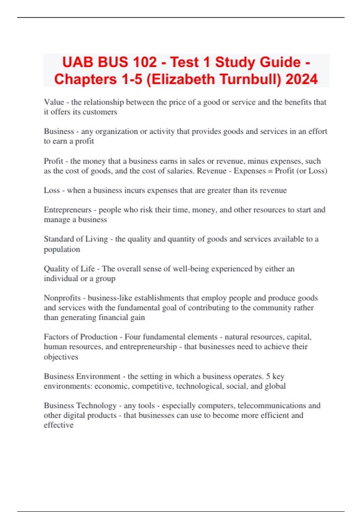 UAB BUS 102 - Test 1 Study Guide - Chapters 1-5 (Elizabeth Turnbull) 2024