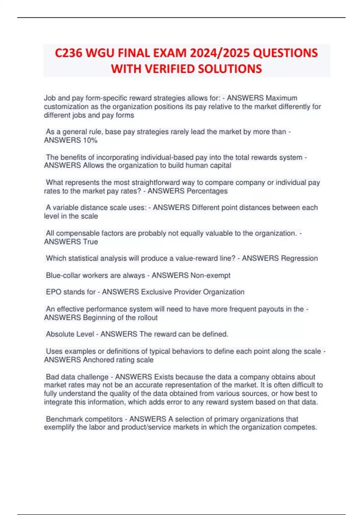 C236 WGU FINAL EXAM 2024/2025 QUESTIONS WITH VERIFIED SOLUTIONS Job and pay form-specific reward strategies allows for: - ANSWERS Maximum customization as the organization positions its pay relative to the market differently for different jobs and pay forms As a general rule, base pay strategies rarely lead the market by more than - ANSWERS 10% The benefits of incorporating individual-based pay into the total rewards system - ANSWERS Allows the organization to build human capital What represents the most straightforward way to compare company or individual pay rates to the market pay rates? - ANSWERS Percentages A variable distance scale uses: - ANSWERS Different point distances between each level in the scale All compensable factors are probably not equally valuable to the organization. - ANSWERS True Which statistical analysis will produce a value-reward line? - ANSWERS Regression Blue-collar workers are always - ANSWERS Non-exempt EPO stands for - ANSWERS Exclusive Provider Organization An effective performance system will need to have more frequent payouts in the - ANSWERS Beginning of the rollout Absolute Level - ANSWERS The reward can be defined. Uses examples or definitions of typical behaviors to define each point along the scale - ANSWERS Anchored rating scale Bad data challenge - ANSWERS Exists because the data a company obtains about market rates may not be an accurate representation of the market. It is often difficult to fully understand the quality of the data obtained from various sources, or how best to integrate this information, which adds error to any reward system based on that data. Benchmark competitors - ANSWERS A selection of primary organizations that exemplify the labor and product/service markets in which the organization competes. Benchmark jobs - ANSWERS Jobs that are representative of the type, content, and level of jobs in the organization. Benefit Benchmark Survey - ANSWERS A tool that helps organizations better understand how employee benefits may impact their ability to attract and retain qualified employees. Benefit level strategy - ANSWERS Refers to the level of each benefit type provided as well as the overall company expenditure. Benefit mix strategy - ANSWERS Refers to the particular combination of benefit types that an organization offers. Broadbanding - ANSWERS Entails the use of a few broad bands (or grades) to organize work for pay purposes. Capability based pay - ANSWERS When a reward system explicitly attempts to vary rewards based upon capabilities of the employees. Types include Skill-based pay, Competency-based pay, and Seniority-based pay. Central tendency - ANSWERS Describes what's typical for a set of data, usually measured by the arithmetic mean, median, or mode. Centralized approach - ANSWERS The Human Resources department makes all decisions relating to pay strategy, as well as specific reward decisions. Centralized Global rewards strategy - ANSWERS Organizations attempt to have a single set of policies that are determined by the organization and utilized at all locations. Classification approach - ANSWERS Uses logical categories and descriptions to organize jobs. Co-pay policy - ANSWERS A policy that requires employees to pay a set amount for each time any service is used. Compa-ratio - ANSWERS A ratio frequently used to measure the conformity of pay rates to the pay plan. Compensable factor - ANSWERS Job elements or criteria that identify what the organization values for purposes of job evaluation. Idenifying compensable factors is step one in the Point factor Approach. Compensatory time - ANSWERS Paid time off instead of overtime pay. Competencies - ANSWERS Configurations of knowledge, skills, and traits that enable employee performance. Consolidated Omnibus Budget Reconciliation Act (COBRA) - ANSWERS An Act which established that employees have a right to continue their employer-sponsored health care plan, at the employees' expense, for up to 18 months. Control costs - ANSWERS Without a variable pay component, labor costs remain the same even when revenues, sales, or profits drop. Performance-based pay helps ensure that when performance is low, the company's cost structure is also reduced. Cost-sharing - ANSWERS An approach in which the insurance only pays for a portion of medical expenses. Critical success factors - ANSWERS Capabilities, activities, customer perceptions, and market positions that allow an organization to outcompete its rivals Decentralized approach - ANSWERS Decisions can be made by the employee's immediate supervisor or manager. Defined benefit - ANSWERS A plan in which an organization uses a time-based formula to calculate how much pension an employee has earned, and upon retirement the organization pays the employee a guaranteed amount per year throughout retirement. Differential piece rate - ANSWERS A system in which a lower rate is paid for the first 10 units assembled, and then a higher rate is paid for each unit over 10 assembled. Differentiation strategy - ANSWERS Providing innovative, exceptional, and high-quality products and/or services to customers Distributive Justice - ANSWERS Perceptions are based upon employees' views of the distribution of rewards in the organization. Employee Retirement Income Security Act (ERISA) - ANSWERS An Act that regulates retirement plans offered by organizations. Employer mandate - ANSWERS A Mandate which states that organizations with 50 or more employees are required to either offer health insurance to their employees or pay an additional tax for not having done so. Employer matching - ANSWERS When an organization matches an employee's contribution to a retirement account, typically up to 3-5% of an employee's salary. Employment based rewards - ANSWERS Rewards that are only contingent on an employee maintaining employment with the organization.