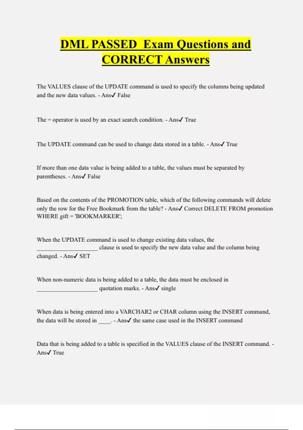 DML PASSED Exam Questions and CORRECT Answers The VALUES clause of the UPDATE command is used to specify the columns being updated and the new data values. - Ans False The = operator is used by an exact search condition. - Ans True The UPDATE command can be used to change data stored in a table. - Ans True If more than one data value is being added to a table, the values must be separated by parentheses. - Ans False