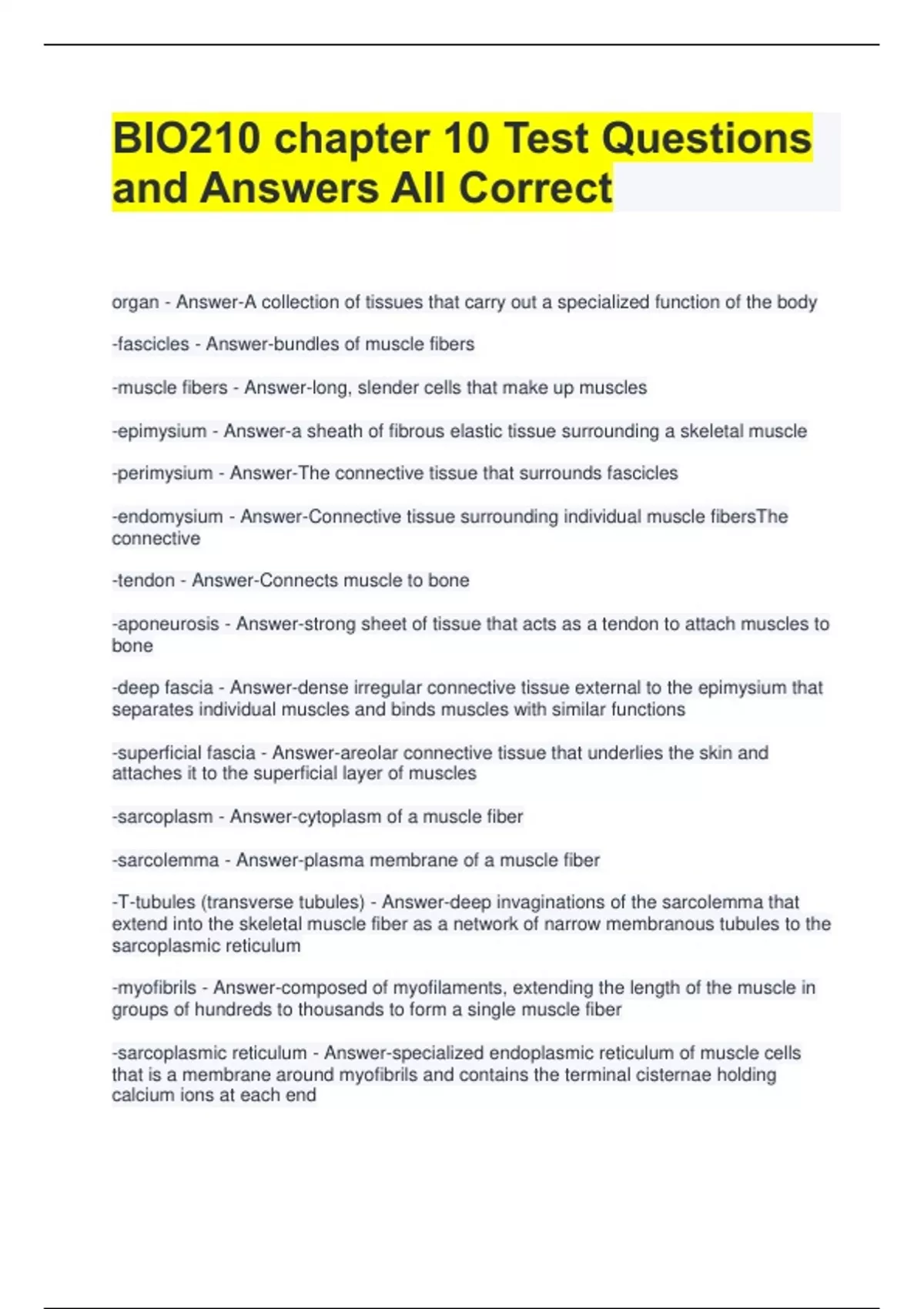 BIO210 chapter 10 Test Questions and Answers All Correct organ - Answer-A collection of tissues that carry out a specialized function of the body -fascicles - Answer-bundles of muscle fibers -muscle fibers - Answer-long, slender cells that make up muscles -epimysium - Answer-a sheath of fibrous elastic tissue surrounding a skeletal muscle -perimysium - Answer-The connective tissue that surrounds fascicles -endomysium - Answer-Connective tissue surrounding individual muscle fibersThe connective -tendon - Answer-Connects muscle to bone -aponeurosis - Answer-strong sheet of tissue that acts as a tendon to attach muscles to bone -deep fascia - Answer-dense irregular connective tissue external to the epimysium that separates individual muscles and binds muscles with similar functions -superficial fascia - Answer-areolar connective tissue that underlies the skin and attaches it to the superficial layer of muscles