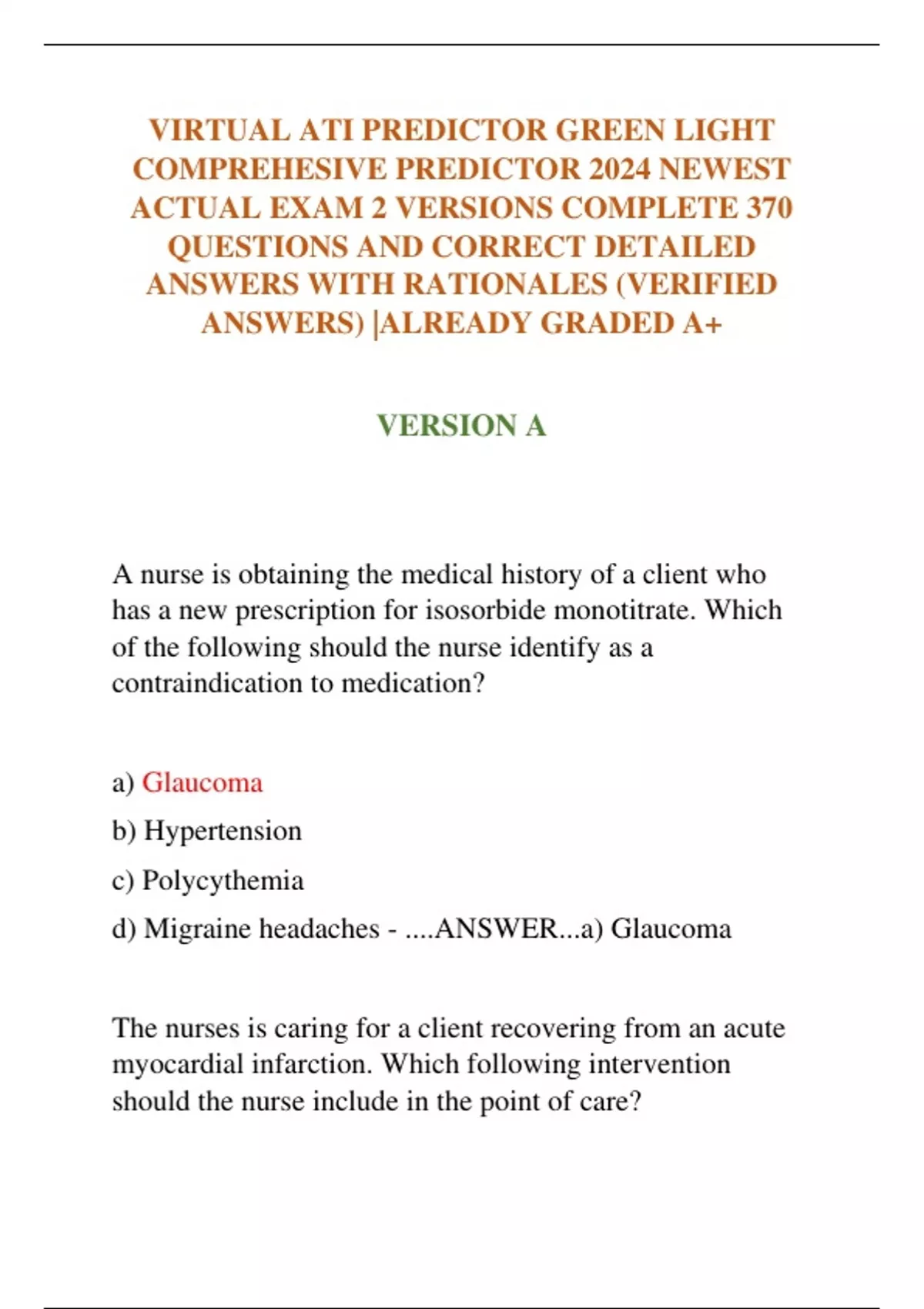 VIRTUAL ATI PREDICTOR GREEN LIGHT COMPREHESIVE PREDICTOR 2024 NEWEST ACTUAL EXAM 2 VERSIONS COMPLETE 370 QUESTIONS AND CORRECT DETAILED ANSWERS WITH RATIONALES (VERIFIED ANSWERS) |ALREADY GRADED A+
