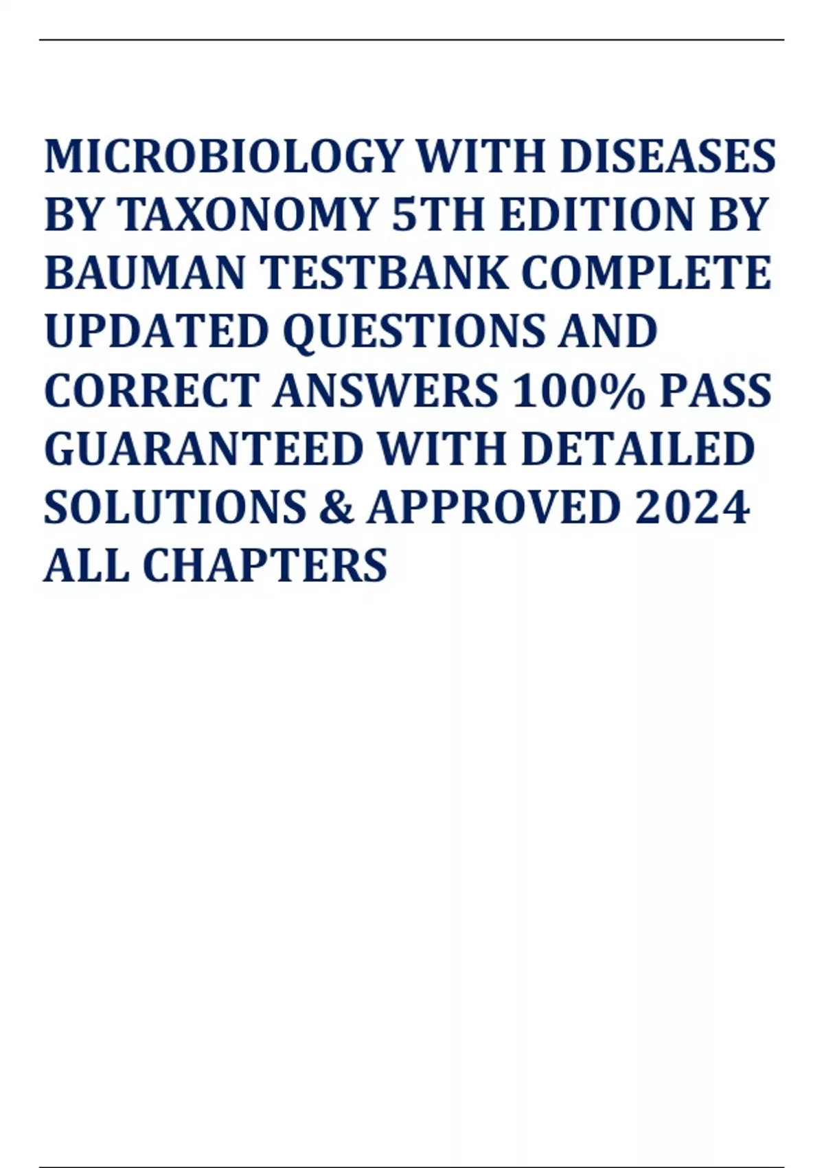 MICROBIOLOGY WITH DISEASES BY TAXONOMY 5TH EDITION BY BAUMAN TESTBANK COMPLETE UPDATED QUESTIONS AND CORRECT ANSWERS 100% PASS GUARANTEED WITH DETAILED SOLUTIONS & APPROVED 2024 ALL CHAPTERS