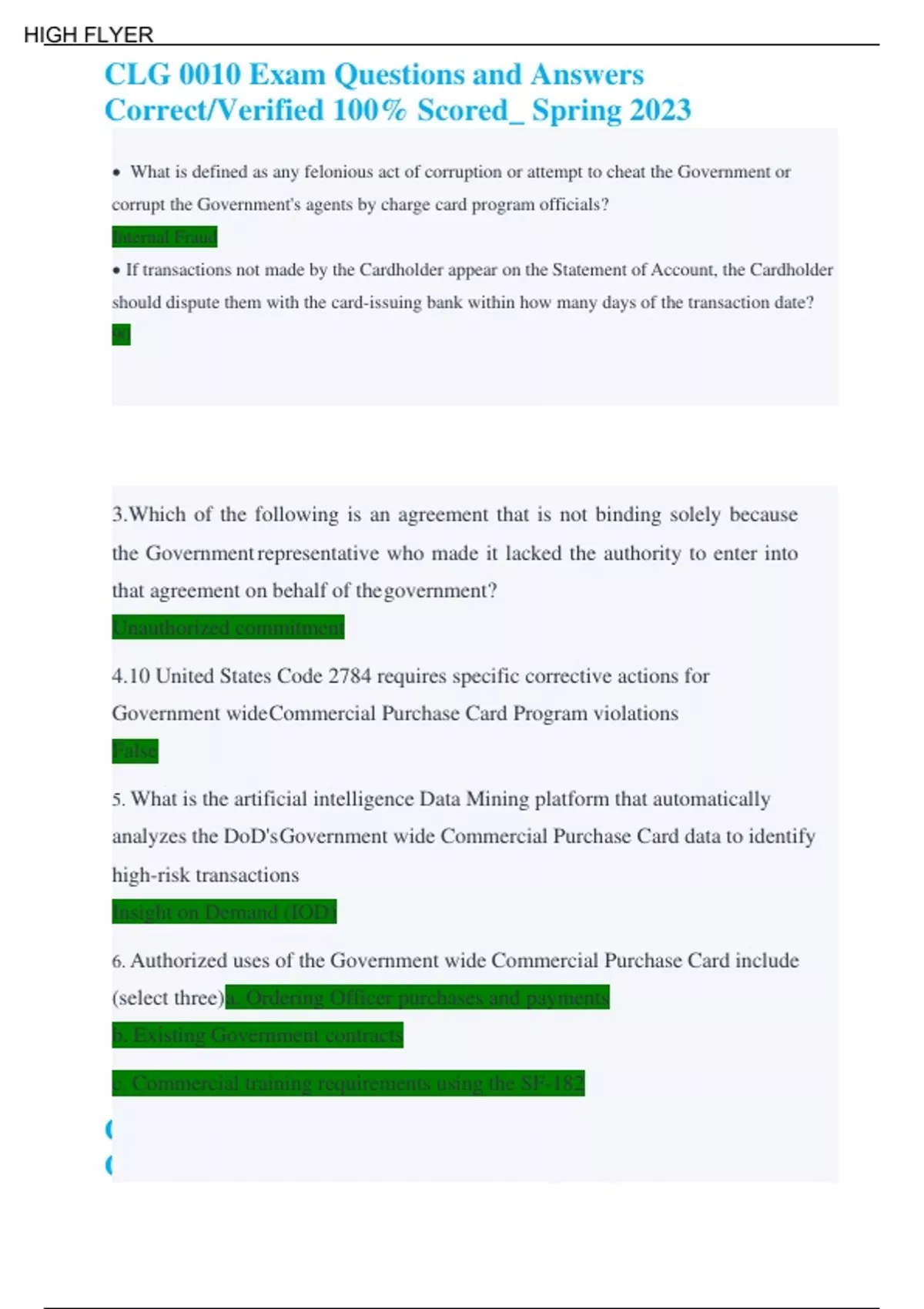CLG 0010 Exam Questions and Answers Correct/Verified 100% Scored_ Spring 2023 CLG 0010 Exam Questions and Answers Correct/Verified 100% Scored_ Spring 2023 3.Which of the following is an agreement that is not binding solely because the Governmentrepresentative who made it lacked the authority to enter into that agreement on behalf of thegovernment? Unauthorized commitment 4.10 United States Code 2784 requires specific corrective actions for Government wideCommercial Purchase Card Program violations False 5. What is the artificial intelligence Data Mining platform that automatically analyzes the DoD'sGovernment wide Commercial Purchase Card data to identify high-risk transactions Insight on Demand (IOD) 6. Authorized uses of the Government wide Commercial Purchase Card include (select three)a. Ordering Officer purchases and payments b. Existing Government contracts c. Commercial training requirements using the SF-182 • What is defined as any felonious act of corruption or attempt to cheat the Government or corrupt the Government's agents by charge card program officials? Internal Fraud • If transactions not made by the Cardholder appear on the Statement of Account, the Cardholder should dispute them with the card-issuing bank within how many days of the transaction date? 90 HIGH FLYER CLG 0010 Exam Questions and Answers Correct/Verified 100% Scored_ Spring 2023 CLG 0010 Exam Questions and Answers Correct/Verified 100% Scored_ Spring 2023 7. Which of the following terms is defined as "the international use of the Government-issuedcharge card in violation of applicable regulations"? Abuse 8. How many Cardholder accounts may be rolled up under a Managing Account?Seven 9. You receive a request to purchase construction services. After obtaining all necessary approvals, you call the construction company, which advises you that the cost for its services willtotal $2,400. You agree to make the purchase, and the construction company accepts your HIGH FLYER CLG 0010 Exam Questions and Answers Correct/Verified 100% Scored_ Spring 2023 CLG 0010 Exam Questions and Answers Correct/Verified 100% Scored_ Spring 2023 Governmentwide Commercial Purchase Card as the method of purchase. What did you dowrong? You made a purchase for construction with the Governmentwide Commercial Purchase Card thatexceeded $2,000 10. Because they are a potential indicator of misuse, abuse, or fraud, delinquent accounts aresubject to what? Increased scrutiny 11. What must the Cardholder do to become qualified to make Governmentwide CommercialPurchase Card purchases up to $25,000 outside of the United States and its jurisdictions? The Cardholder must receive customized training 12. Which of the following is a Cardholder responsibility in the Governmentwide CommercialPurchase Card Program? Reconcile the monthly Statement of Account 13. Which of the following is an appropriate circumstance for using a convenience check?A merchant does not accept payment by credit card 14. How long does Foreign Military Sales documentation have to be retained following caseclosure? 10 years 15. In order to use the Governmentwide Commercial Purchase Card for simplified acquisitionsup to $25,000 outside the United States and its jurisdictions, the Cardholder, merchant, and supply delivery/service execution must all be outside the United States and its jurisdictions. True 16. Cardholders may be granted authority to use their Governmentwide Commercial PurchaseCard accounts to make payments against contracts. True HIGH FLYER CLG 0010 Exam Questions and Answers Correct/Verified 100% Scored_ Spring 2023 CLG 0010 Exam Questions and Answers Correct/Verified 100% Scored_ Spring 2023 17. If required office paper is available from a mandatory source of supply (such as the Committee for Purchase from People Who Are Blind or Severely Disabled), the Cardholder mustpurchase the paper from the mandatory source, even if similar paper is available at a lower price from a non-mandatory source. True HIGH FLYER CLG 0010 Exam Questions and Answers Correct/Verified 100% Scored_ Spring 2023 CLG 0010 Exam Questions and Answers Correct/Verified 100% Scored_ Spring 2023 Every Governmentwide Commercial Purchase Card Cardholder should be issued both a card andconvenience checks. False Cardholders who hold an Ordering Officer delegation must follow Component procedures fororder placement. These procedures will address requirements related to which three of the following? a. Small business b. competition public notification Which three of the following constitute Cardholder fraud? a. A Cardholder's unauthorized purchase of power tools for personal useb. Paying for repairs of privately owned equipment c. Purchasing items or extra quantity of items for resale or to give away to relatives In step 10 of the Governmentwide Commercial Purchase Card Program, what are three pieces ofinformation that should be included in the Cardholder Purchase Log? a. Name of the requestor b. Date on which the item/service was orderedc. Total dollar value of the transaction Whose responsibility is it to comply with Government agency Standards of Conduct? (Select thethree that apply.)