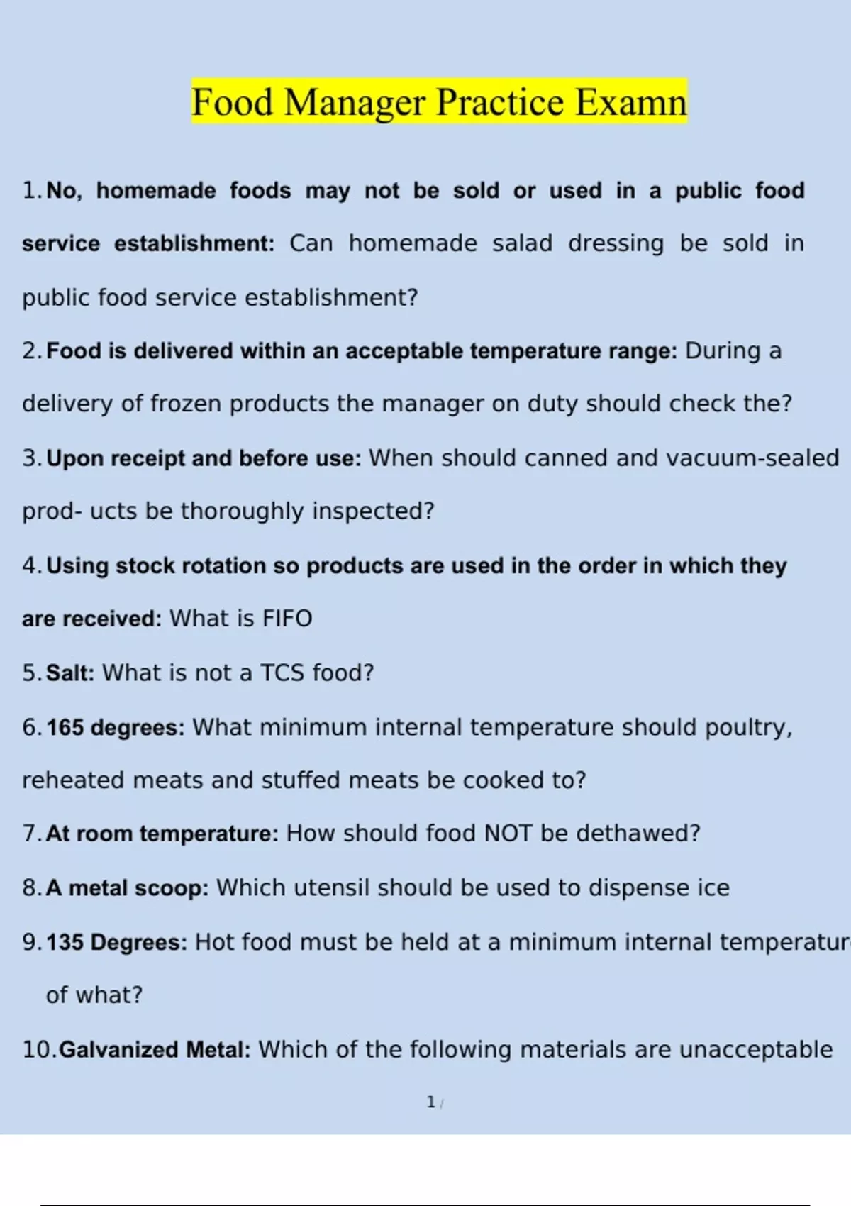 Food Manager Practice Exam Questions and Answers Graded A+ 2024/2025