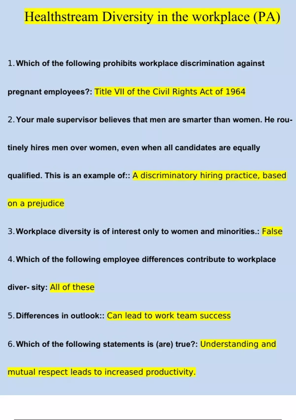 Healthstream Diversity in the workplace (PA) Questions and Answers 100% Verified 2024/2025