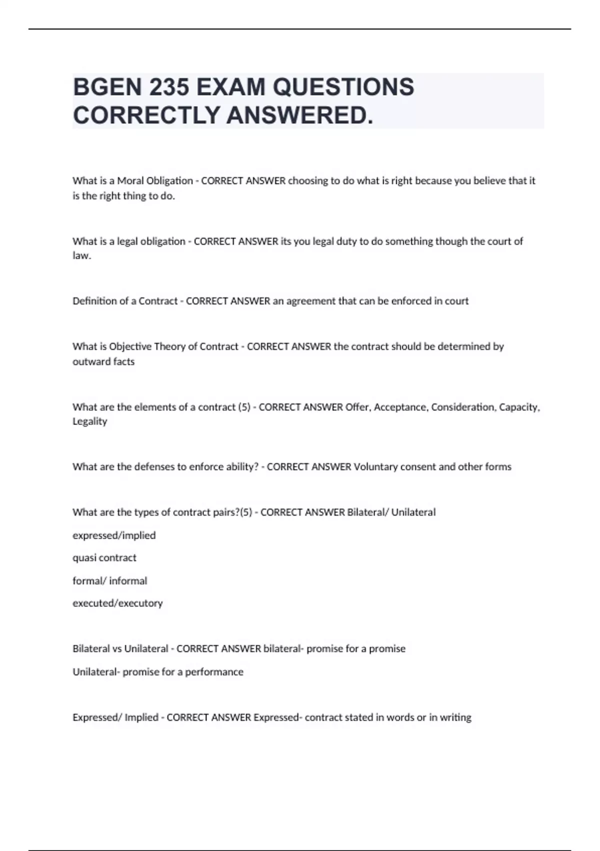 BGEN 235 EXAM QUESTIONS CORRECTLY ANSWERED. What is a Moral Obligation - CORRECT ANSWER choosing to do what is right because you believe that it is the right thing to do. What is a legal obligation - CORRECT ANSWER its you legal duty to do something though the court of law. Definition of a Contract - CORRECT ANSWER an agreement that can be enforced in court What is Objective Theory of Contract - CORRECT ANSWER the contract should be determined by outward facts What are the elements of a contract (5) - CORRECT ANSWER Offer, Acceptance, Consideration, Capacity, Legality What are the defenses to enforce ability? - CORRECT ANSWER Voluntary consent and other forms What are the types of contract pairs?(5) - CORRECT ANSWER Bilateral/ Unilateral expressed/implied quasi contract formal/ informal executed/executory Bilateral vs Unilateral - CORRECT ANSWER bilateral- promise for a promise Unilateral- promise for a performance Expressed/ Implied - CORRECT ANSWER Expressed- contract stated in words or in writing Implied- contract formed from conduct of parties Quasi Contract - CORRECT ANSWER contracts implied by law Formal/ informal - CORRECT ANSWER formal- a contract that requires specific format informal- a contract that does not require a specific format executed/ executory - CORRECT ANSWER executed- a contract that has been fulfilled executory- a contract that has not been fully fulfilled