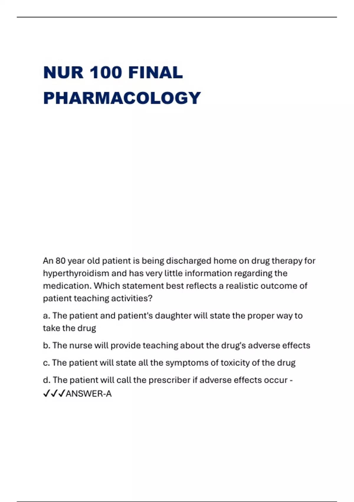 NUR 100 FINAL PHARMACOLOGY An 80 year old patient is being discharged home on drug therapy for hyperthyroidism and has very little information regarding the medication. Which statement best reflects a realistic outcome of patient teaching activities? a. The patient and patient's daughter will state the proper way to take the drug b. The nurse will provide teaching about the drug's adverse effects c. The patient will state all the symptoms of toxicity of the drug d. The patient will call the prescriber if adverse effects occur - ANSWER-A A patient has a new prescription for a blood pressure medication that may cause him to feel dizzy during the first few days of therapy. Which is the best human needs statement for this situation? a. physical activity b. physical safety c. physical pain d. interchange of gases - ANSWER-B A patient's medical record includes an order that reads as follows: "Atenolol 25 mg once daily at 0900". Which action by the nurse is correct? a. the nurse does not give the drug b. the nurse gives the drug orally c. the nurse gives the drug intravenously d. the nurse contacts the prescriber to clarify the dosage route - ANSWER-D A 77 y/o man who has been diagnosed with an upper respiratory tract infection tells the nurse that he is allergic to penicillin. Which is the most appropriate response by the nurse? a. Many people are allergic to penicillin b. This allergy is not of major concern because the drug is given so often c. what type of reaction did you have when you took penicillin? d. drug allergies don't usually occur in older individuals due to built up resistance to allergic reactions - ANSWER-C The nurse is preparing a care plan for a patient who has been newly diagnosed with type 2 diabetes mellitus. Which of these reflect the correct order of the steps of the nursing process? a. assessment, planning, human needs statement, implementation, evaluation b. eval, assessment, human needs statement, planning, implementation c. human needs statement, assessment, planning, implementation, eval d. assessment, human needs statement, planning, implementation, eval - ANSWER-D An elderly woman took a prescription medicine to help her sleep; however, she felt restless all night and did not sleep at all. The nurse recognizes that this woman has experienced which type or reaction or effect? a. allergic reaction b. idiosyncratic reaction c. mutagenic effect d. synergistic effect - ANSWER-B