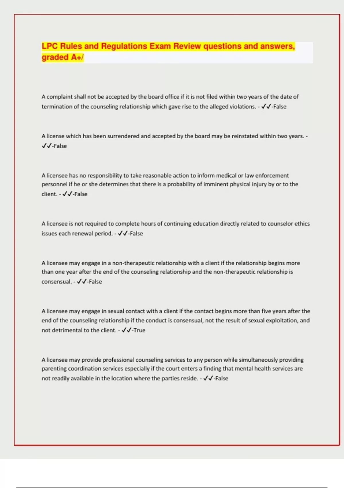 LPC Rules and Regulations Exam Review questions and answers, graded A+/ A complaint shall not be accepted by the board office if it is not filed within two years of the date of termination of the counseling relationship which gave rise to the alleged violations. - -False A license which has been surrendered and accepted by the board may be reinstated within two years. - -False A licensee has no responsibility to take reasonable action to inform medical or law enforcement personnel if he or she determines that there is a probability of imminent physical injury by or to the client. - -False A licensee is not required to complete hours of continuing education directly related to counselor ethics issues each renewal period. - -False A licensee may engage in a non-therapeutic relationship with a client if the relationship begins more than one year after the end of the counseling relationship and the non-therapeutic relationship is consensual. - -False A licensee may engage in sexual contact with a client if the contact begins more than five years after the end of the counseling relationship if the conduct is consensual, not the result of sexual exploitation, and not detrimental to the client. - -True A licensee may provide professional counseling services to any person while simultaneously providing parenting coordination services especially if the court enters a finding that mental health services are not readily available in the location where the parties reside. - -Fals