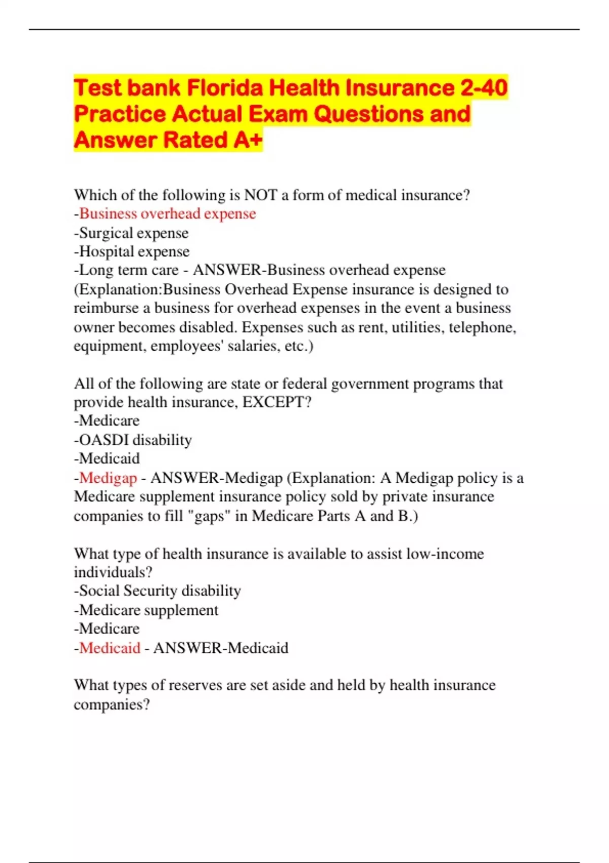 Test bank Florida Health Insurance 2-40 Practice Actual Exam Questions and Answer Rated A+