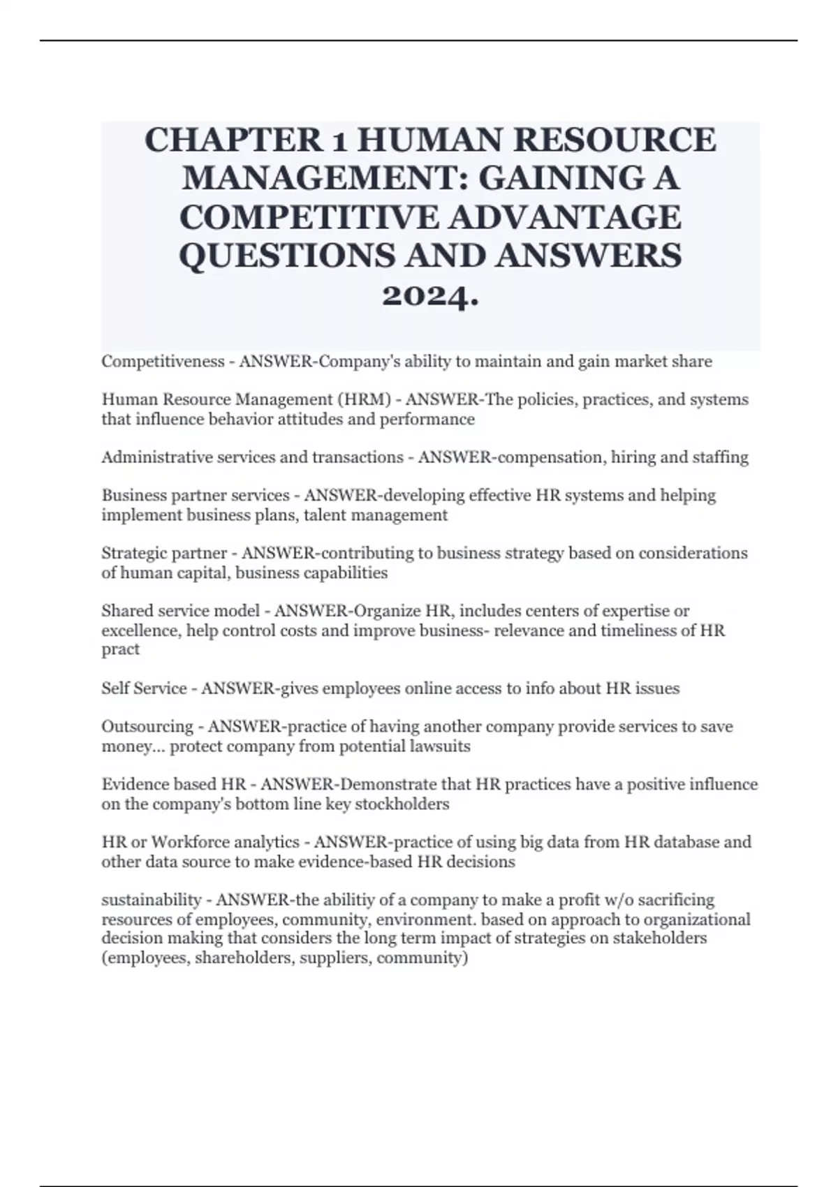 CHAPTER 1 HUMAN RESOURCE MANAGEMENT: GAINING A COMPETITIVE ADVANTAGE QUESTIONS AND ANSWERS 2024.