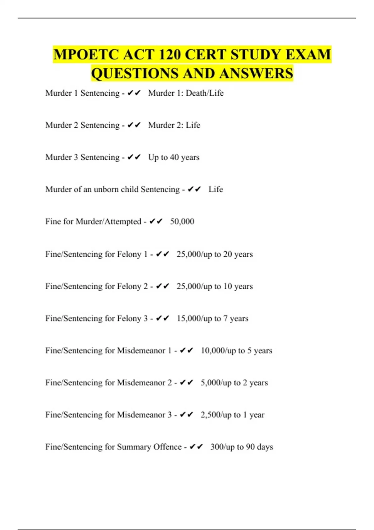 Murder 1 Sentencing - Murder 1: Death/Life Murder 2 Sentencing - Murder 2: Life Murder 3 Sentencing - Up to 40 years Murder of an unborn child Sentencing - Life Fine for Murder/Attempted - 50,000 Fine/Sentencing for Felony 1 - 25,000/up to 20 years Fine/Sentencing for Felony 2 - 25,000/up to 10 years Fine/Sentencing for Felony 3 - 15,000/up to 7 years Fine/Sentencing for Misdemeanor 1 - 10,000/up to 5 years Fine/Sentencing for Misdemeanor 2 - 5,000/up to 2 years Fine/Sentencing for Misdemeanor 3 - 2,500/up to 1 year Fine/Sentencing for Summary Offence - 300/up to 90 days What is the Bill of Rights? - First 10 amendments of the U.S. Constitution 1st Amendment - Freedom of Religion, Speech, Press, Assembly, and Petition 2nd Amendment - Right to keep and bear arms 3rd Amendment - No quartering of troops 4th Amendment - Right to privacy/Unreasonable search and seizure 5th Amendment - The Right to Remain Silent/Double Jeopardy, right to due process 6th Amendment - Right to a speedy trial, jury, informed council, witnesses 7th Amendment - Right to jury in some civil trials/Prohibition of double jeopardy 8th Amendment - Right to bail/Prohibits cruel and unusual punishment 9th Amendment - No rights will act to take away other rights enumerated 10th Amendment - Defines limitations of power