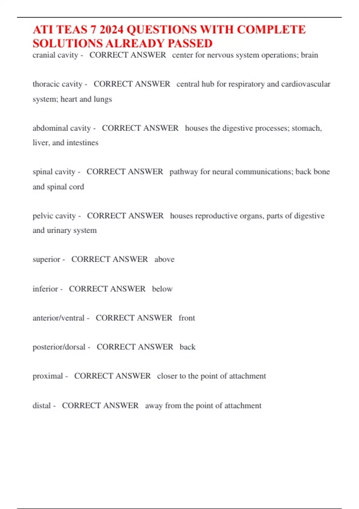 cranial cavity - CORRECT ANSWER center for nervous system operations; brain thoracic cavity - CORRECT ANSWER central hub for respiratory and cardiovascular system; heart and lungs abdominal cavity - CORRECT ANSWER houses the digestive processes; stomach, liver, and intestines spinal cavity - CORRECT ANSWER pathway for neural communications; back bone and spinal cord pelvic cavity - CORRECT ANSWER houses reproductive organs, parts of digestive and urinary system superior - CORRECT ANSWER above inferior - CORRECT ANSWER below anterior/ventral - CORRECT ANSWER front posterior/dorsal - CORRECT ANSWER back proximal - CORRECT ANSWER closer to the point of attachment distal - CORRECT ANSWER away from the point of attachment ATI TEAS 7 2024 QUESTIONS WITH COMPLETE SOLUTIONS ALREADY PASSED medial - CORRECT ANSWER toward the midline of the body lateral - CORRECT ANSWER away from the midline of the body superficial - CORRECT ANSWER near the surface deep - CORRECT ANSWER away from the surface sagittal plane - CORRECT ANSWER vertical plane that divides the body into the left and right mid-sagittal plane - CORRECT ANSWER splits the body into equal left and right halves coronal/frontal plane - CORRECT ANSWER vertical plane that divides into anterior and posterior transverse/horizontal plane - CORRECT ANSWER divides body into superior and inferior the maintenance of normal blood sugar is what type of feedback mechanism? - CORRECT ANSWER negative; in negative feedback mechanisms, the system responds to reverse the direction of a change, aiming to return the system to a set point. blood sugar regulation - CORRECT ANSWER when blood sugar levels rise, the pancreas secretes insulin to promote the uptake of glucose into cells, reducing blood