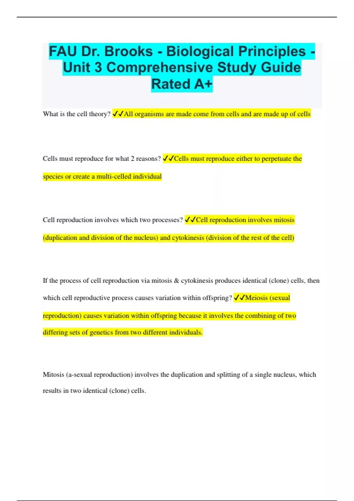 FAU Dr. Brooks - Biological Principles - Unit 3 Comprehensive Study Guide Rated A+