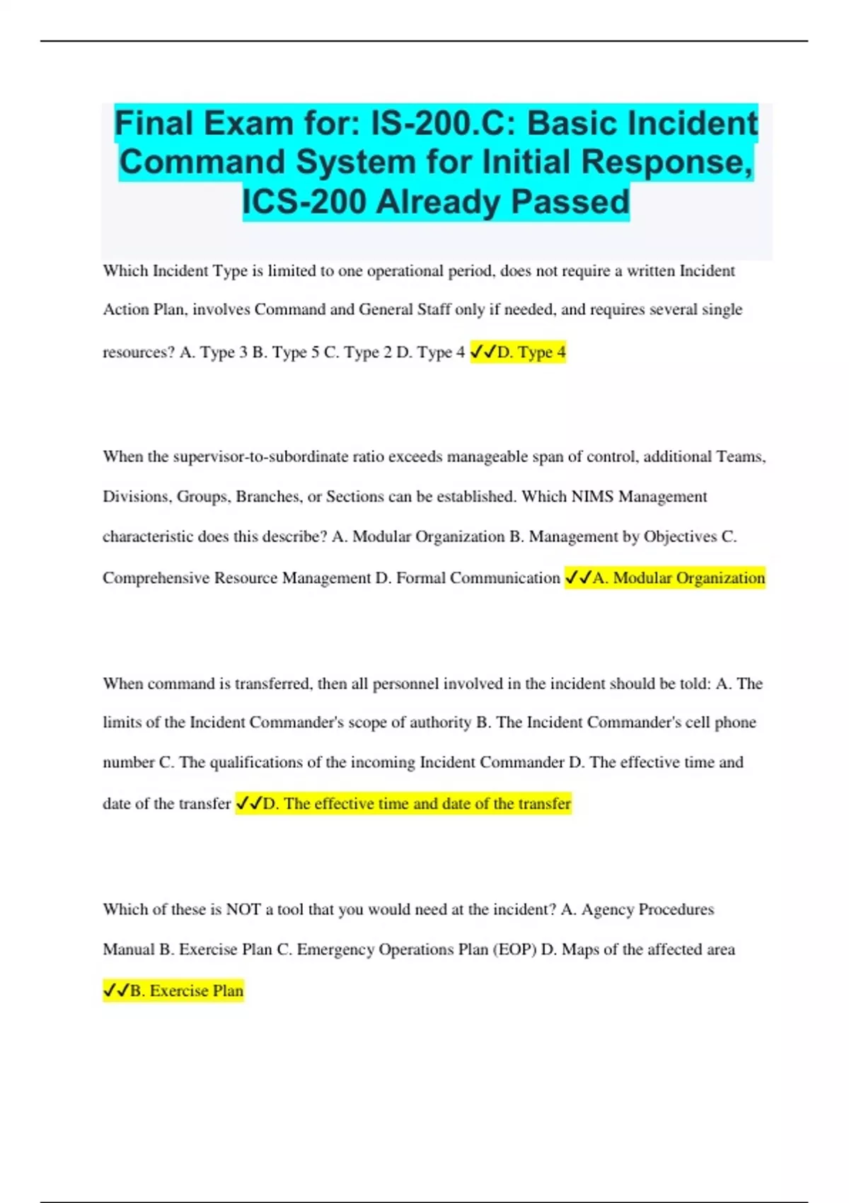 Which Incident Type is limited to one operational period, does not require a written Incident Action Plan, involves Command and General Staff only if needed, and requires several single resources? A. Type 3 B. Type 5 C. Type 2 D. Type 4 D. Type 4 When the supervisor-to-subordinate ratio exceeds manageable span of control, additional Teams, Divisions, Groups, Branches, or Sections can be established. Which NIMS Management characteristic does this describe? A. Modular Organization B. Management by Objectives C. Comprehensive Resource Management D. Formal Communication A. Modular Organization When command is transferred, then all personnel involved in the incident should be told: A. The limits of the Incident Commander's scope of authority B. The Incident Commander's cell phone number C. The qualifications of the incoming Incident Commander D. The effective time and date of the transfer D. The effective time and date of the transfer Which of these is NOT a tool that you would need at the incident? A. Agency Procedures Manual B. Exercise Plan C. Emergency Operations Plan (EOP) D. Maps of the affected area B. Exercise PlanWhich type of briefing is delivered to individual resources or crews who are assigned to operational tasks and/or work at or near the incident site?