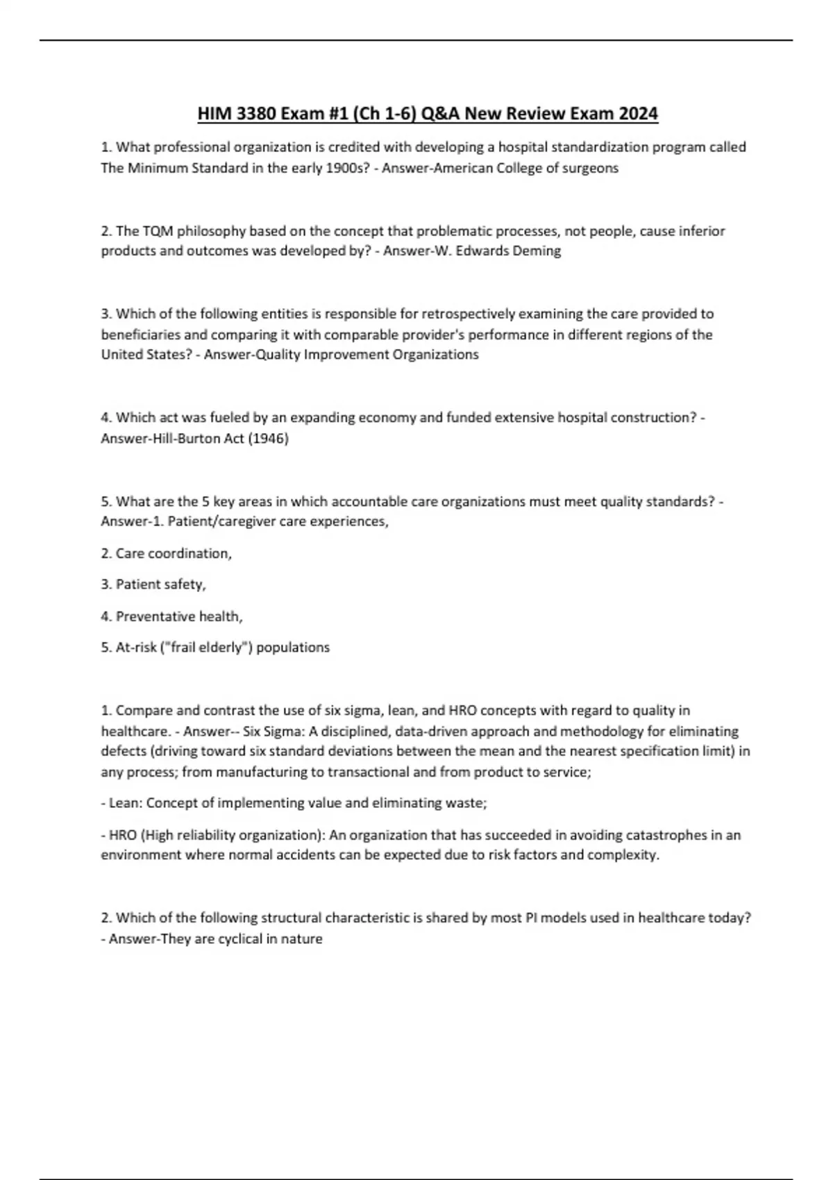 HIM 3380 Exam #1 (Ch 1-6) Q&A New Review Exam 2024 1. What professional organization is credited with developing a hospital standardization program called The Minimum Standard in the early 1900s? - Answer-American College of surgeons 2. The TQM philosophy based on the concept that problematic processes, not people, cause inferior products and outcomes was developed by? - Answer-W. Edwards Deming 3. Which of the following entities is responsible for retrospectively examining the care provided to beneficiaries and comparing it with comparable provider's performance in different regions of the United States? - Answer-Quality Improvement Organizations 4. Which act was fueled by an expanding economy and funded extensive hospital construction? - Answer-Hill-Burton Act (1946) 5. What are the 5 key areas in which accountable care organizations must meet quality standards? - Answer-1. Patient/caregiver care experiences, 2. Care coordination, 3. Patient safety, 4. Preventative health, 5. At-risk ("frail elderly") populations 1. Compare and contrast the use of six sigma, lean, and HRO concepts with regard to quality in healthcare. - Answer- CONTINUES...