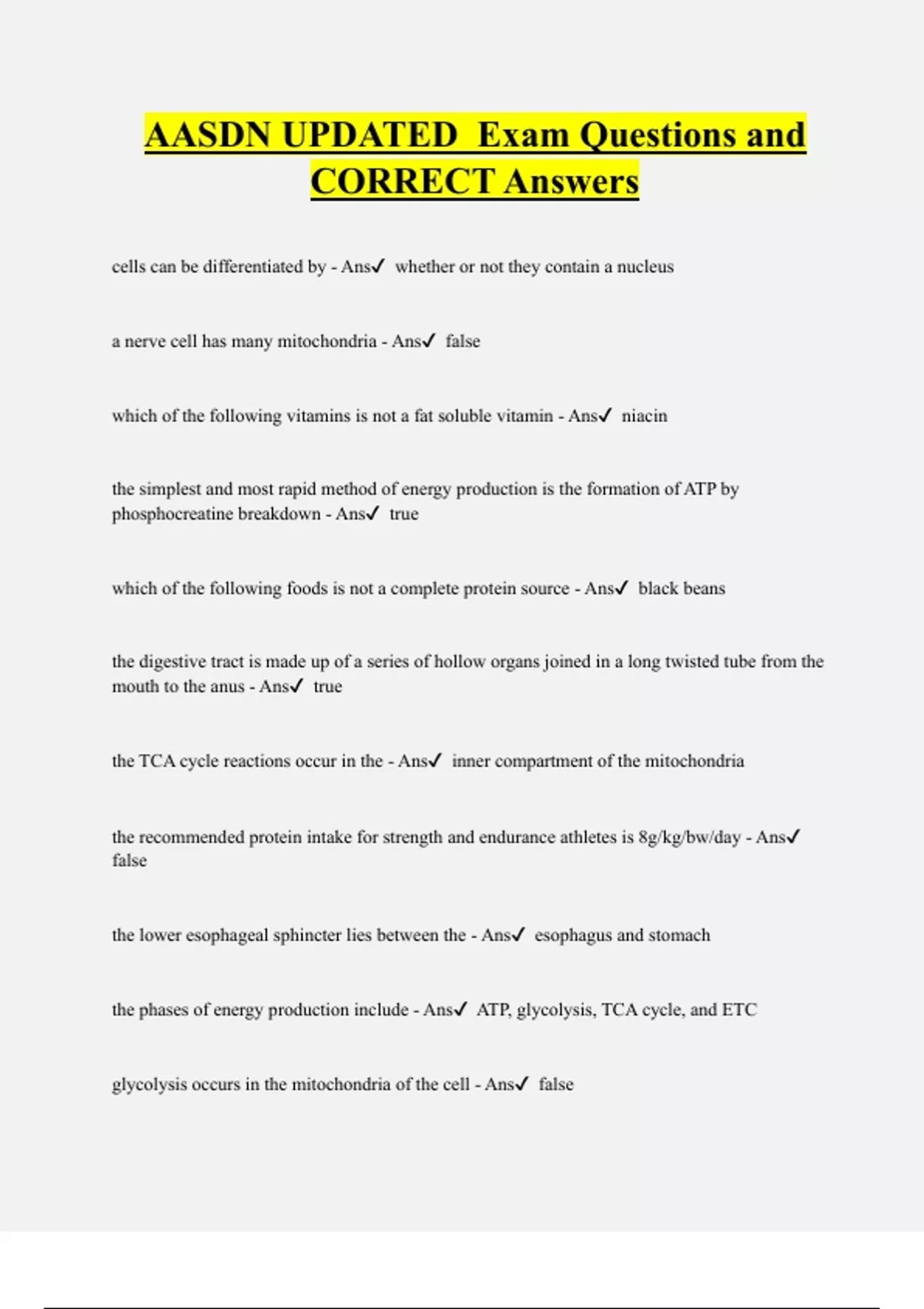 AASDN UPDATED Exam Questions and CORRECT Answers cells can be differentiated by - Ans whether or not they contain a nucleus a nerve cell has many mitochondria - Ans false which of the following vitamins is not a fat soluble vitamin - Ans niacin the simplest and most rapid method of energy production is the formation of ATP by phosphocreatine breakdown - Ans true