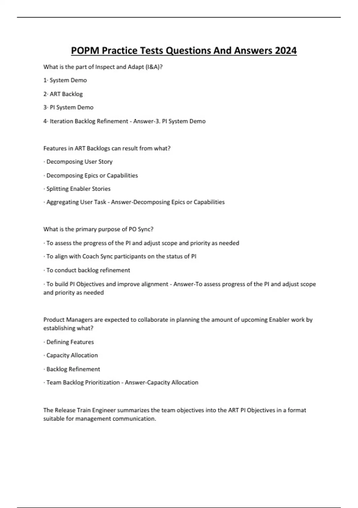 POPM Practice Tests Questions And Answers 2024 What is the part of Inspect and Adapt (I&A)? 1· System Demo 2· ART Backlog 3· PI System Demo 4· Iteration Backlog Refinement - Answer-3. PI System Demo Features in ART Backlogs can result from what? · Decomposing User Story · Decomposing Epics or Capabilities · Splitting Enabler Stories · Aggregating User Task - Answer-Decomposing Epics or Capabilities What is the primary purpose of PO Sync? · To assess the progress of the PI and adjust scope and priority as needed · To align with Coach Sync participants on the status of PI · To conduct backlog refinement · To build PI Objectives and improve alignment - Answer-To assess progress of the PI and adjust scope and priority as needed Product Managers are expected to collaborate in planning the amount of upcoming Enabler work by establishing what? · Defining Features · Capacity Allocation · Backlog Refinement · Team Backlog Prioritization - Answer-Capacity Allocation The Release Train Engineer summarizes the team objectives into the ART PI Objectives in a format suitable for management communication. · TRUE · FALSE - Answer-TRUE How frequently should the ART Backlog be reviewed?